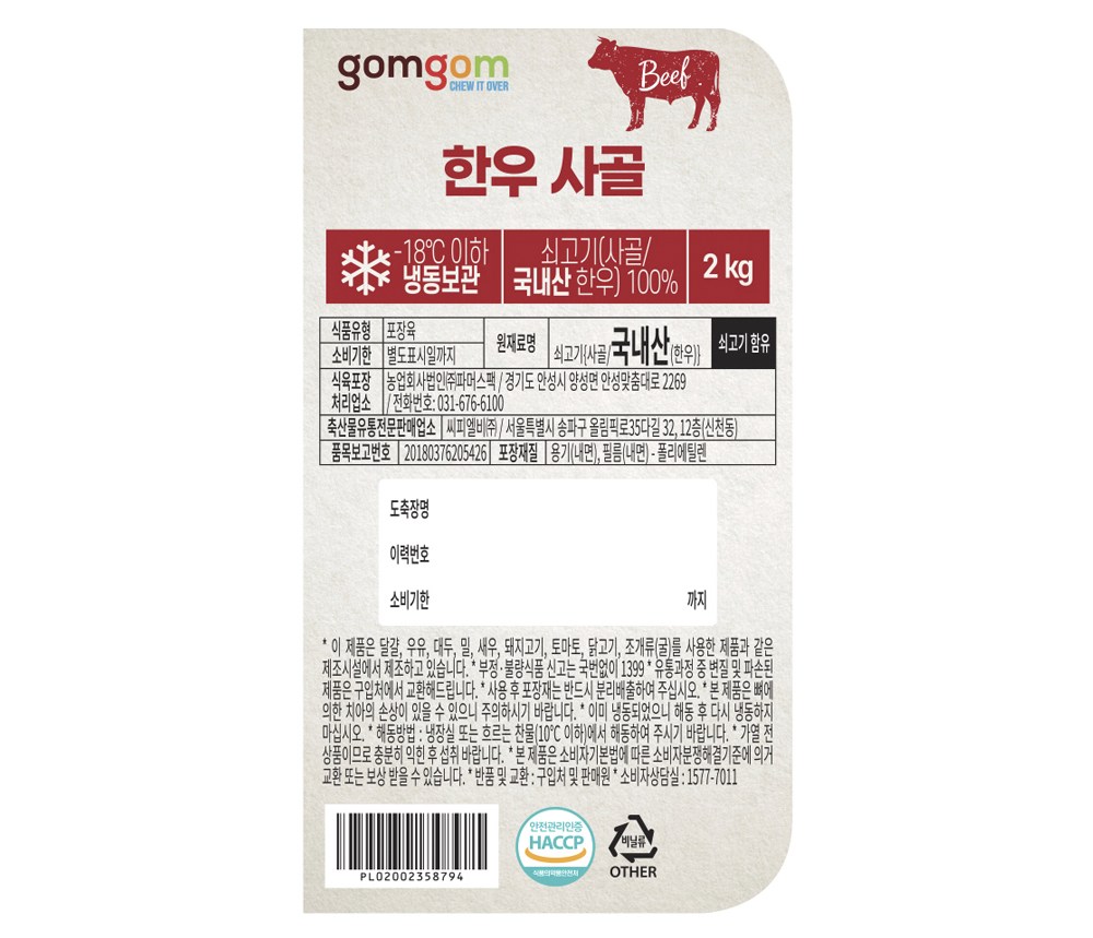 | 품목 또는 명칭 | 한우 사골 | 포장단위별 내용물의 용량(중량),수량,크기 | 2kg |