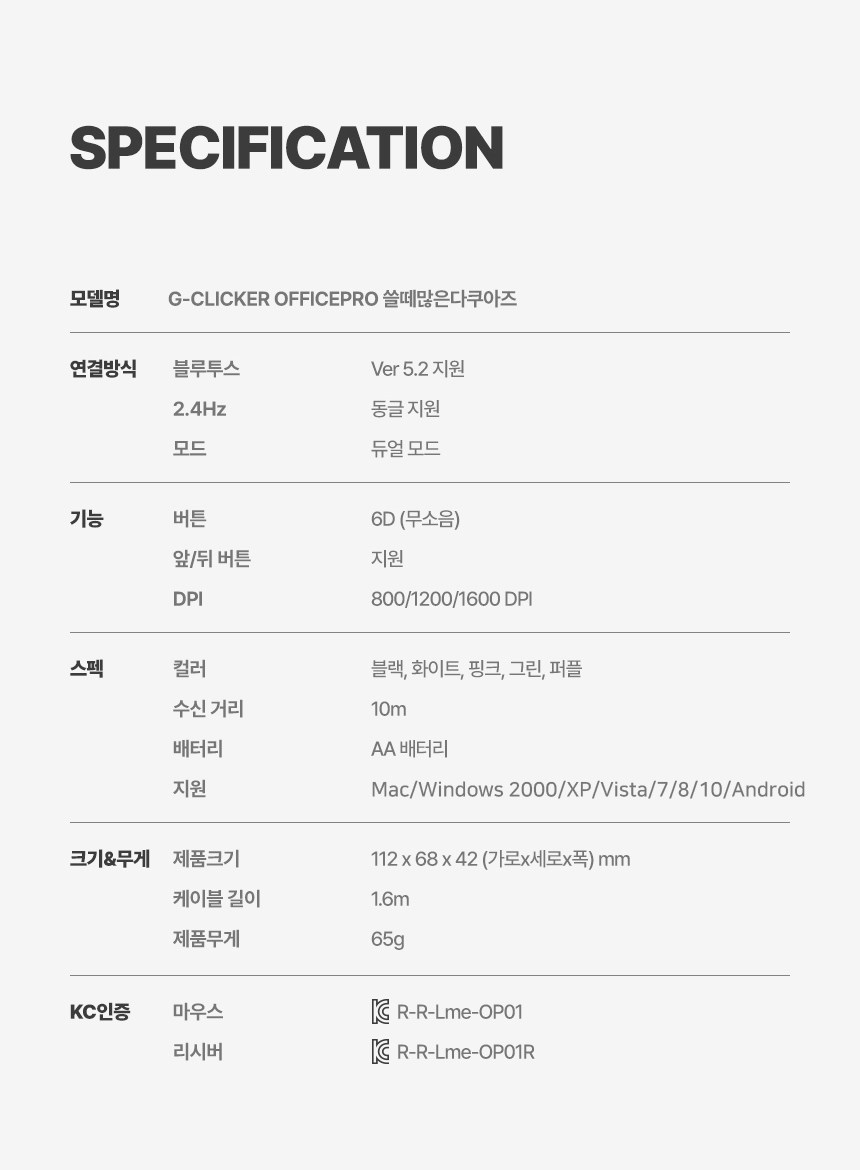 | 품명 및 모델명 | 지클릭커 오피스프로 쓸떼많은다쿠아즈 무소음 블루투스 마우스 그린 G-CLICKER OFFICEPRO / 쓸떼많은 다쿠아즈 | KC 인증정보 | 본품: R-R-Lme-OP01 / 리시버: R-R-Lme-OP01R / 건전지: B053R5018-18001 |