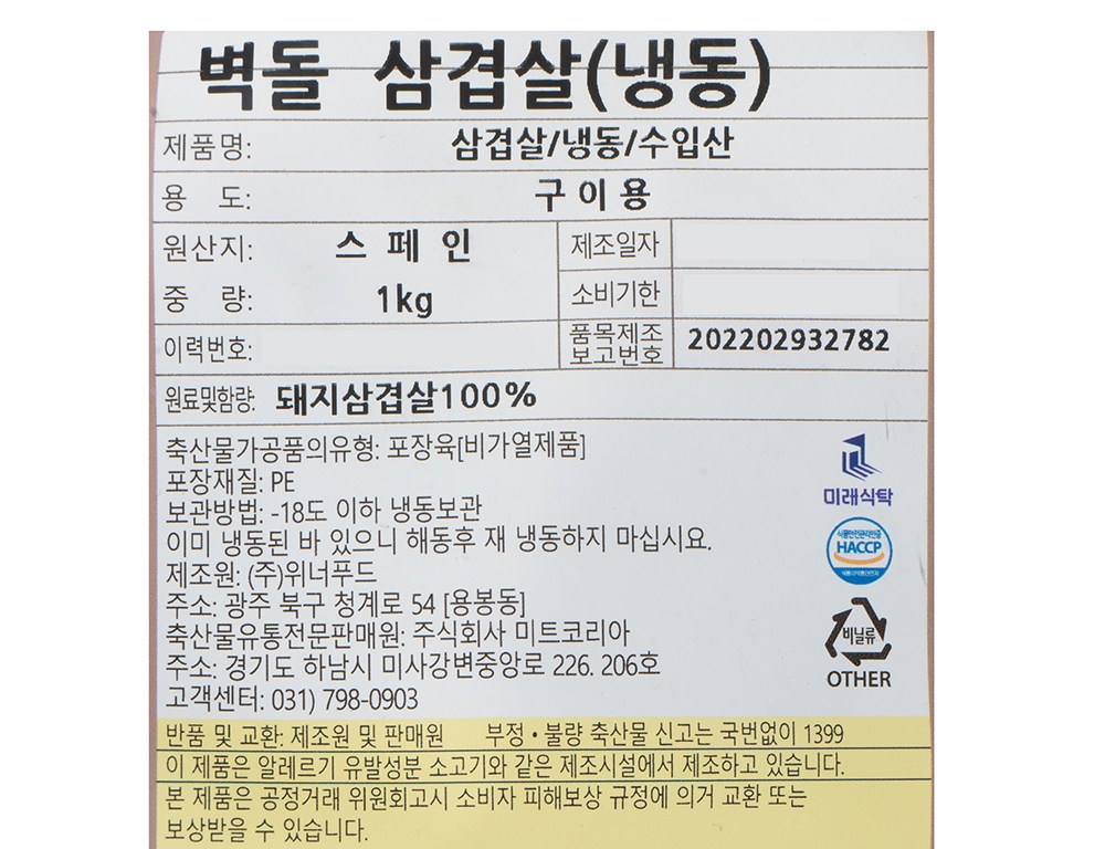 | 제조연월일, 소비기한 또는 품질유지기한 | 소비기한(또는 유통기한) : 2027년 02월 23일 이거나 그 이후인 상품 제조년월일 : 2026년 02월 24일 이후인 제조상품 | 세부 품목군별 표시사항 | 축산물 등급표시 : 해당 없음 / 이력번호 표시유무 : 이력번호 표시제품임 |