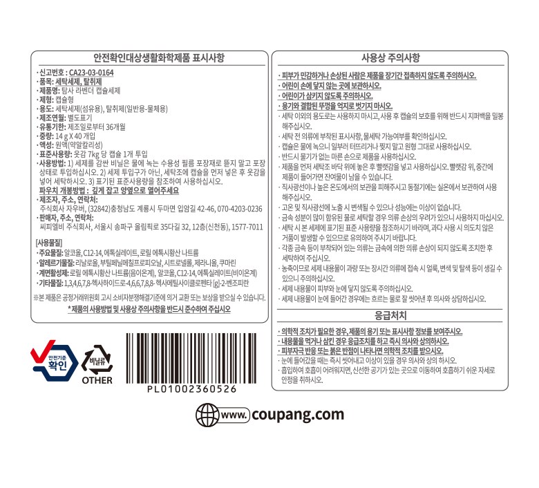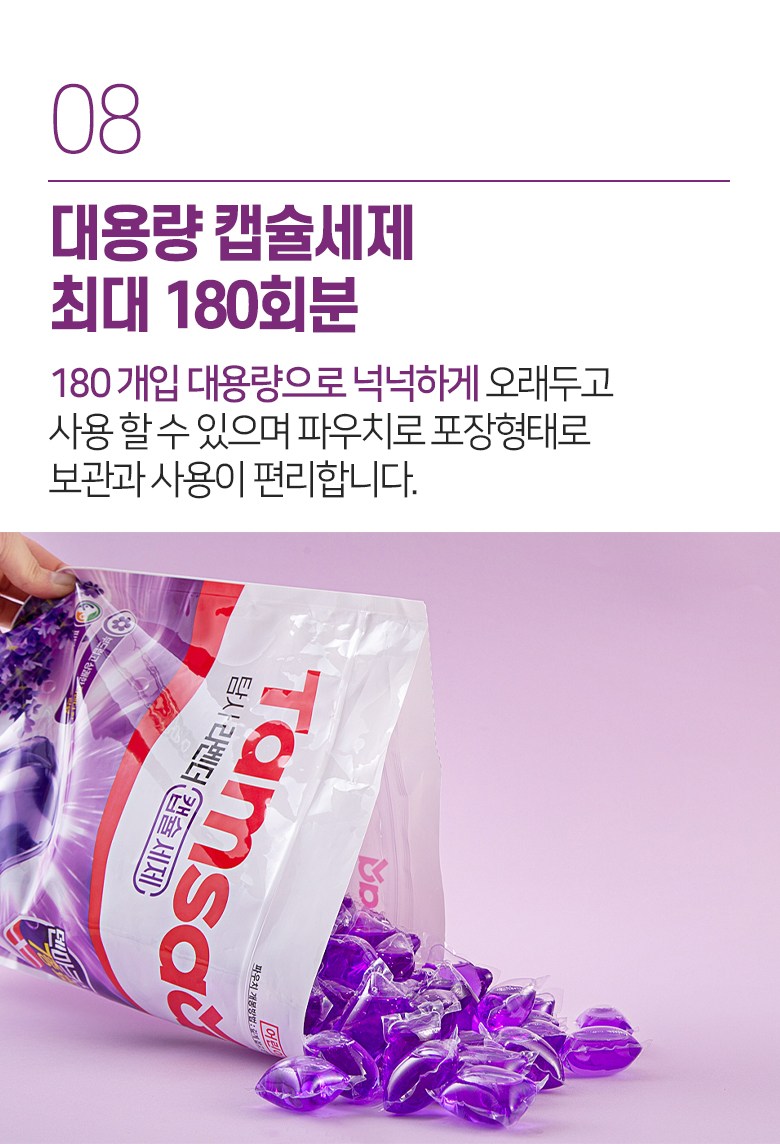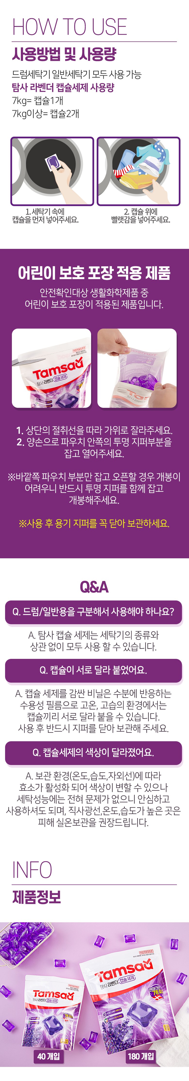 | 품목 및 제품명 | 세탁세제, 탈취제 / 탐사 라벤더 캡슐 세제 | 용도(표백제의 경우 계열을 함께표시) 및 제형 | 세탁세제 - 섬유용, 탈취제 - 일반용(물체용) / 캡슐형 |