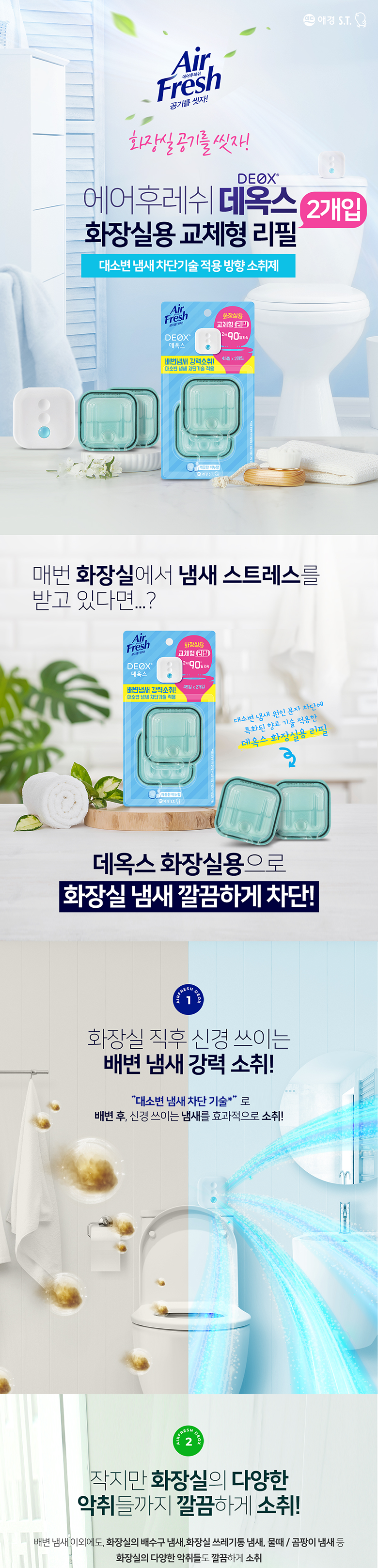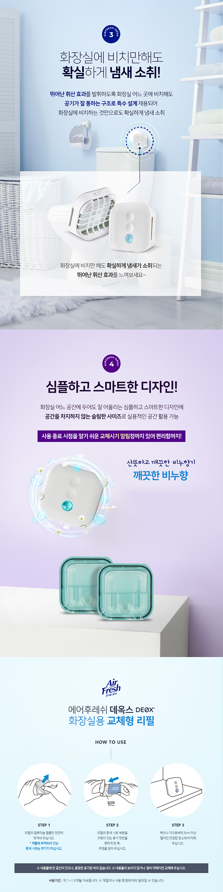 | 품목 및 제품명 | 방향제,탈취제 / 에어후레쉬 데옥스 화장실용 리필(깨끗한 비누향) | 용도(표백제의 경우 계열을 함께표시) 및 제형 | 일반용(실내공간용) / 액체형 |