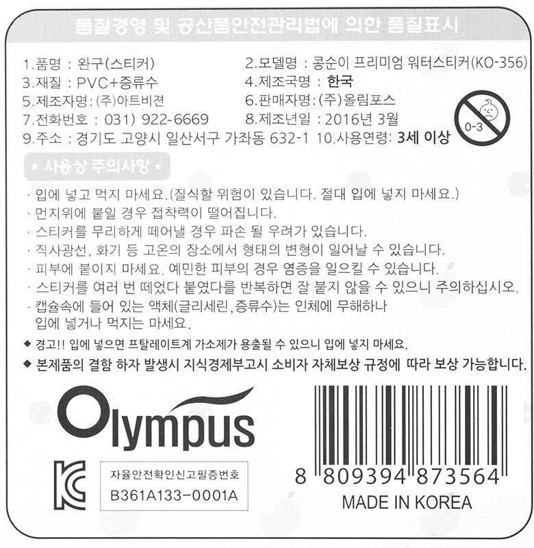 | 품명 및 모델명 | 콩순이워터 스티커2 | KC 인증정보 | B361A133-0001A |