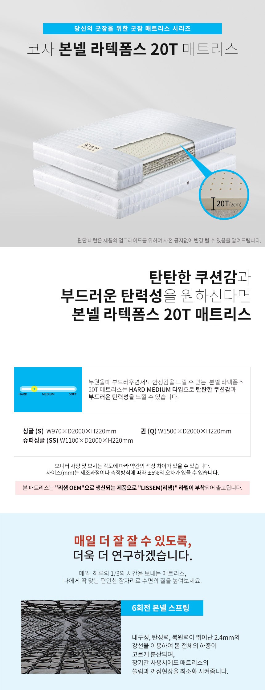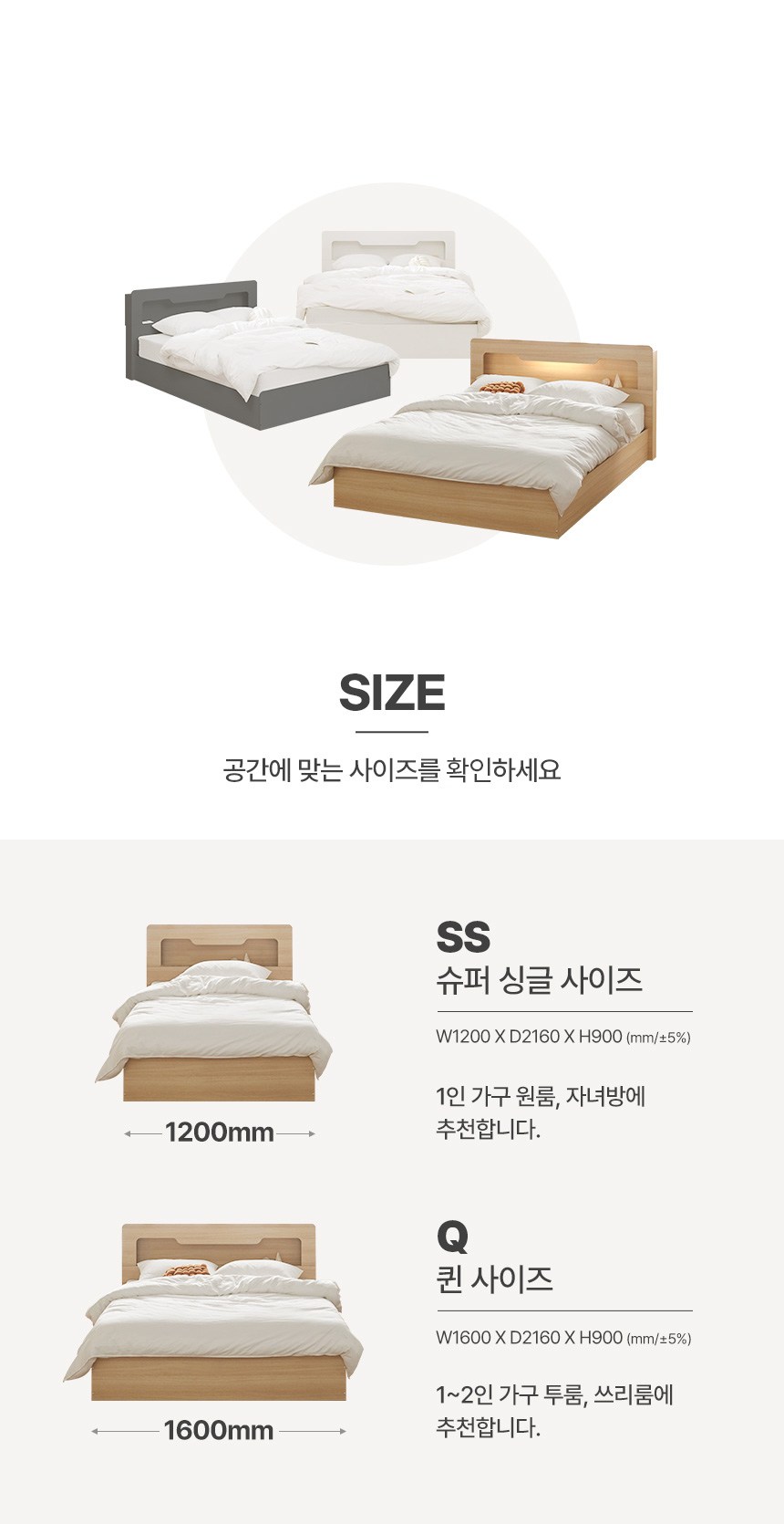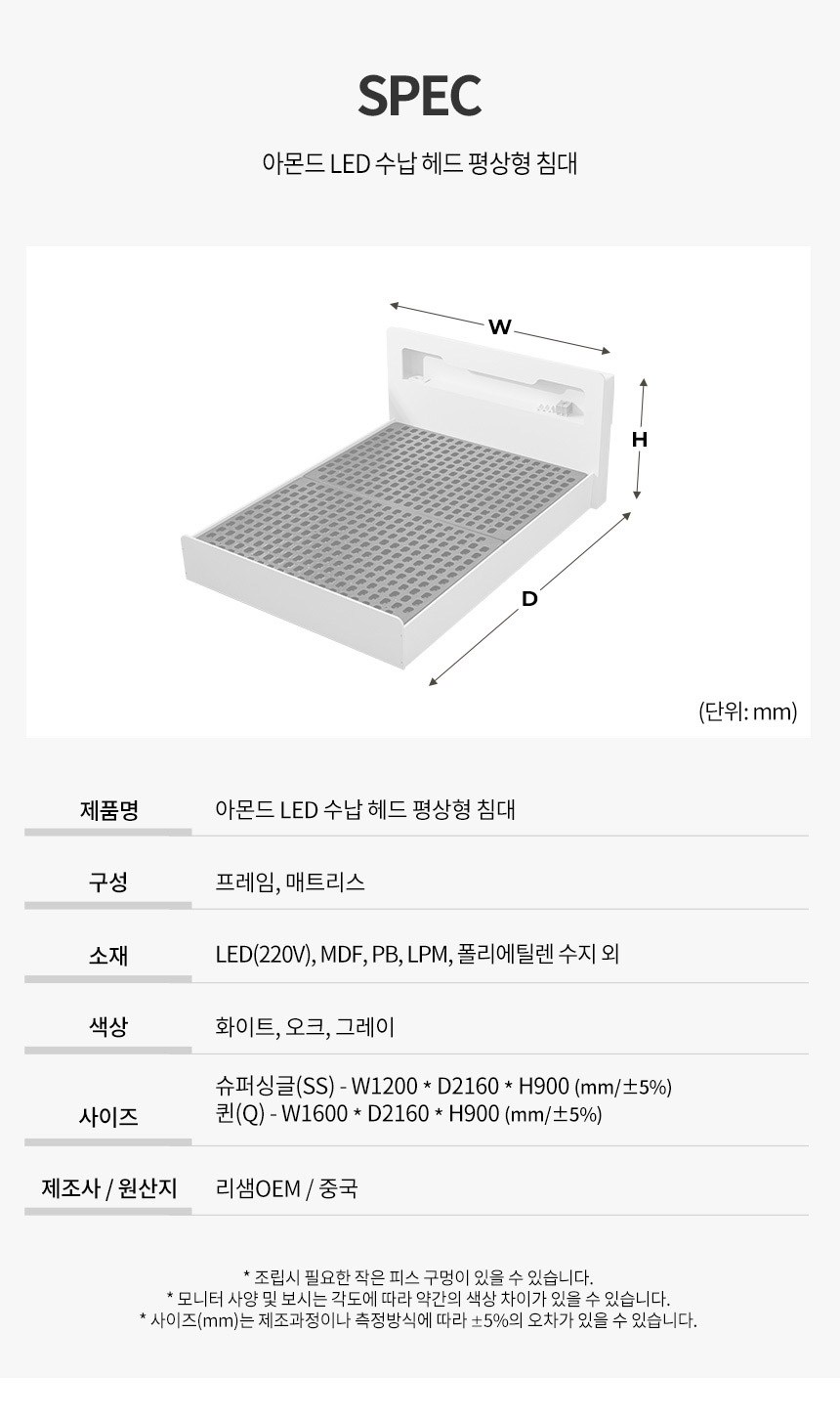 - 사이즈: 침대(1200 x 2160 x 900 mm), 매트리스(1100 x 2000 x 220 mm)
