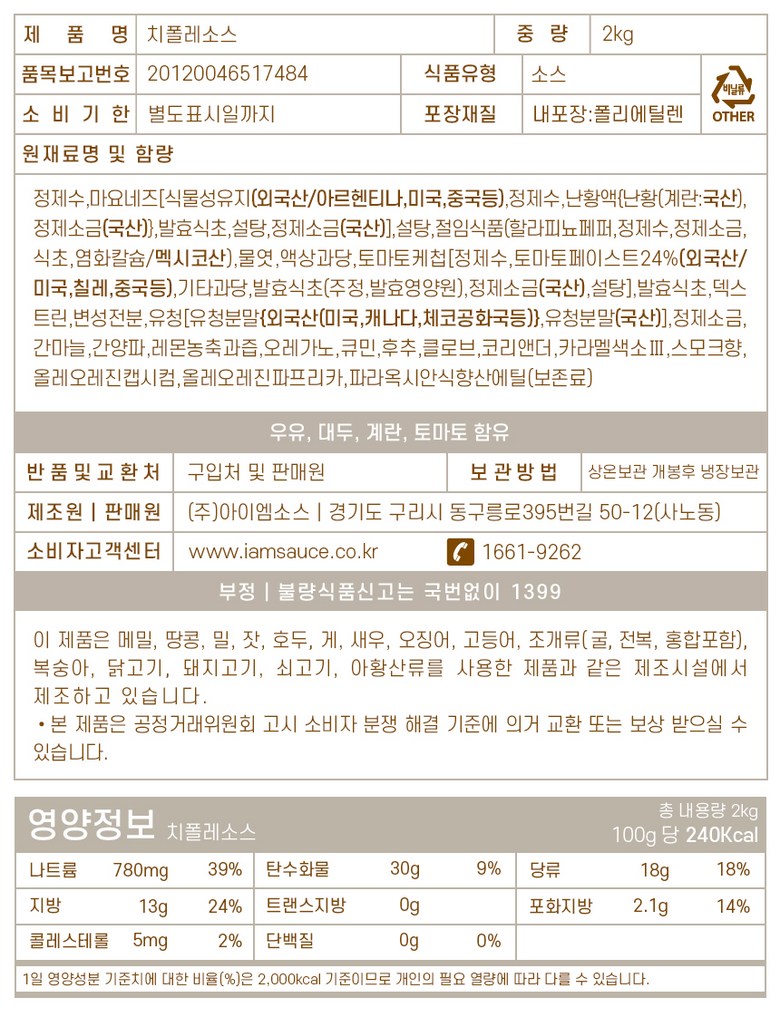 | 포장단위별 내용물의 용량(중량), 수량 | 2kg / 1ea | 원재료명 및 함량 | 정제수,마요네즈[식물성유지(외국산/아르헨티나,미국,중국등),정제수,난황액{난황(계란:국산),정제소금(국산)},발효식초,설탕,정제소금(국산)],설탕,절임식품(할라피뇨페퍼,정제수,정제소금,식초,염화칼슘/멕시코산),물엿,액상과당,토마토케첩[정제수,토마토페이스트24%(외국산/미국,칠레,중국등),기타과당,발효식초(주정,발효영양원),정제소금(국산),설탕],발효식초,덱스트린,변성전분,유청[유청분말{외국산(미국,캐나다,체코공화국등)},유청분말(국산)],정제소금,간마늘,간양파,레몬농축과즙,오레가노,큐민,후추,클로브,코리앤더,카라멜색소Ⅲ,스모크향,올레오레진캡시컴,올레오레진파프리카,파라옥시안식향산에틸(보존료) |