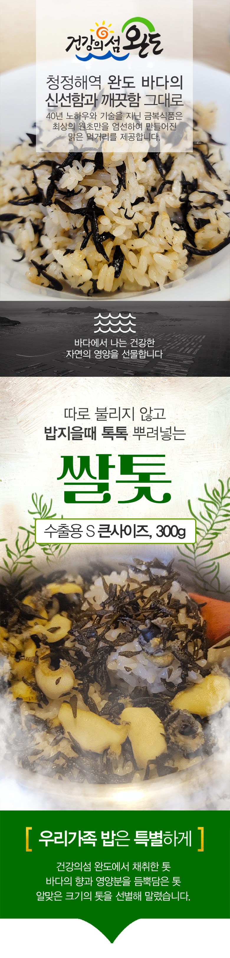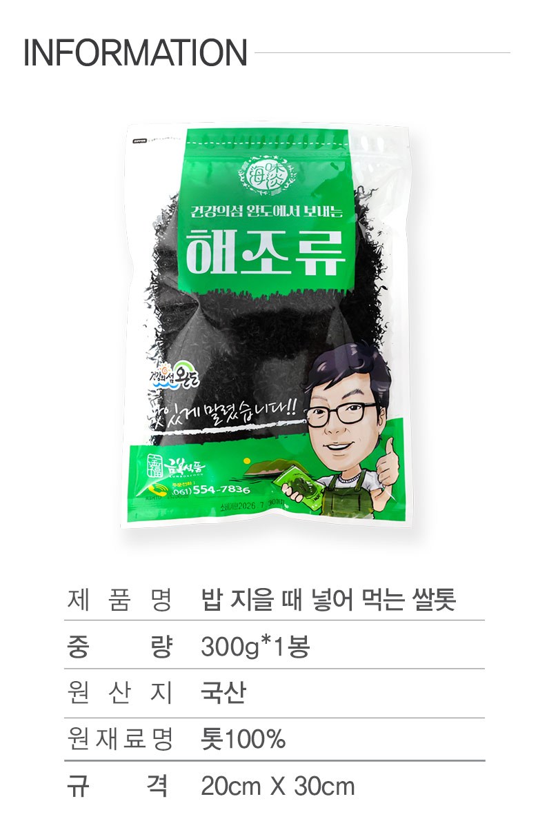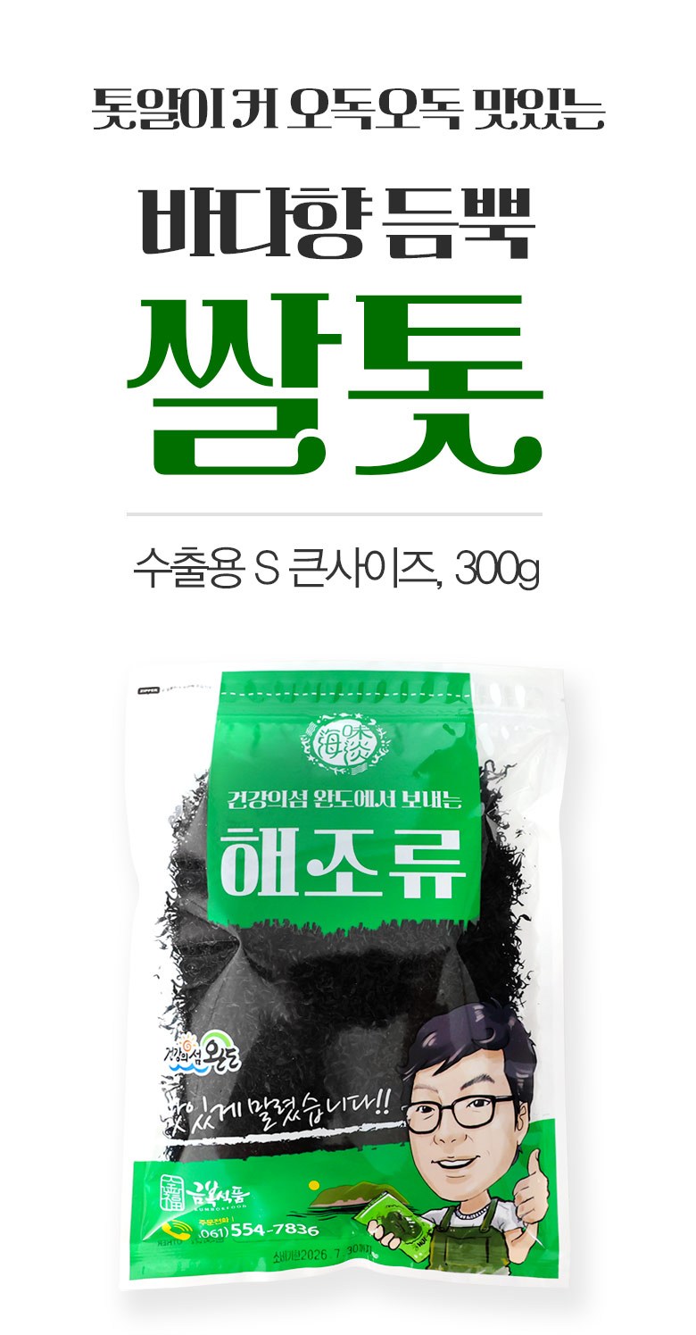 | 포장단위별 내용물의 용량(중량), 수량 | 300g, 1봉 | 원재료명 및 함량 | 톳 100% |