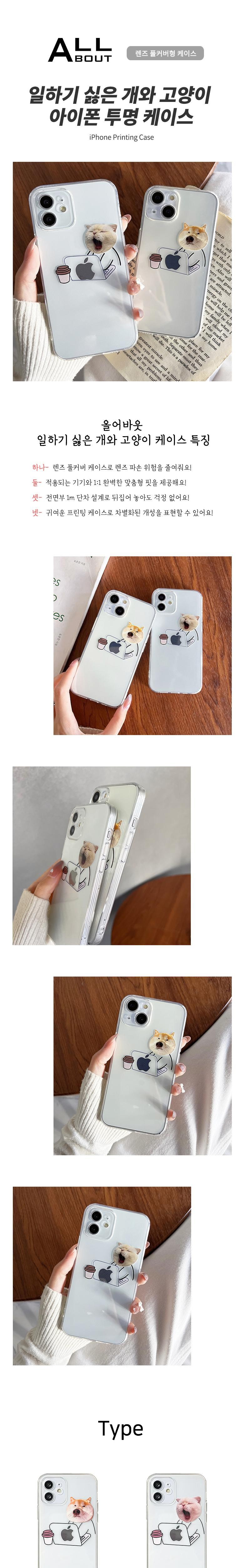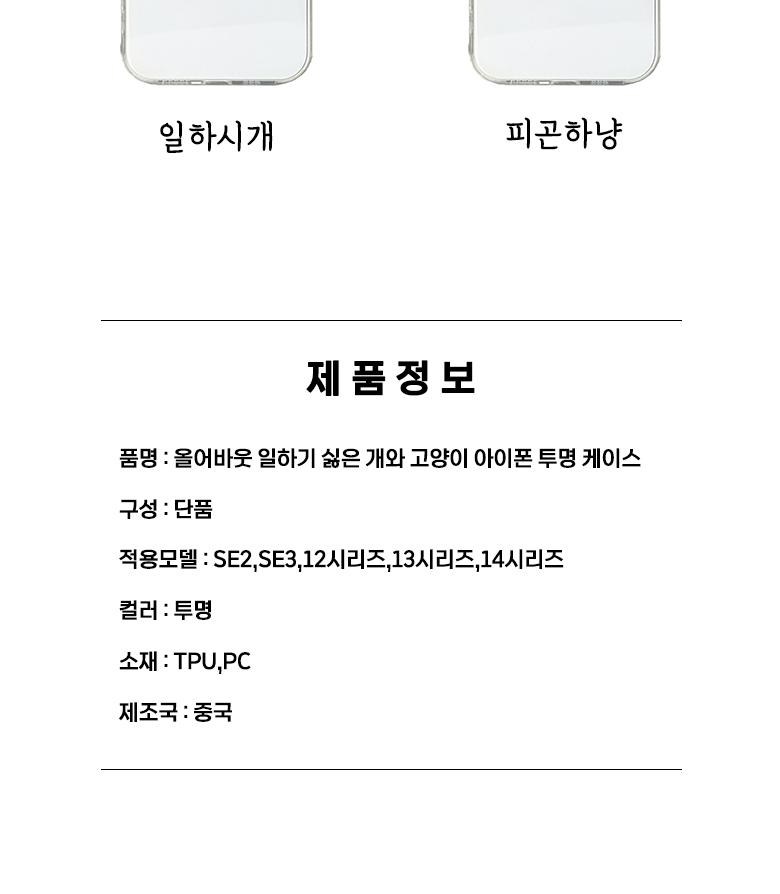 | 품명 및 모델명 | ALLABOUT 일하기 싫은 개와 고양이 프린팅 투명 휴대폰 케이스 | 인증/허가 사항 | 해당없음 |