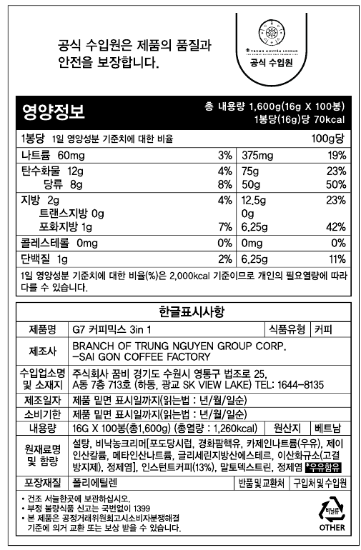 | 포장단위별 내용물의 용량(중량), 수량 | 16g*100개*2개 | 원재료명 및 함량 | 컨텐츠 참조 |