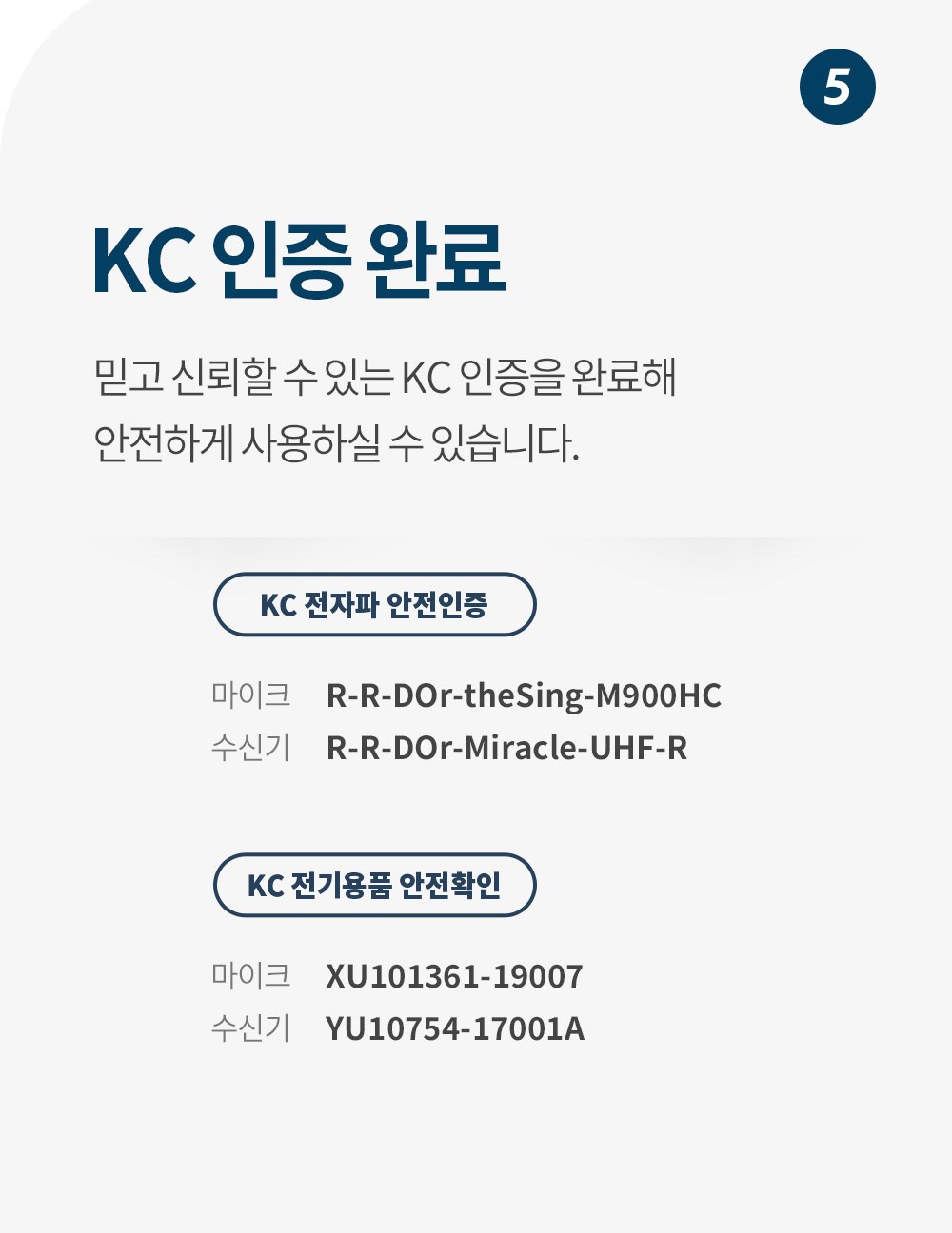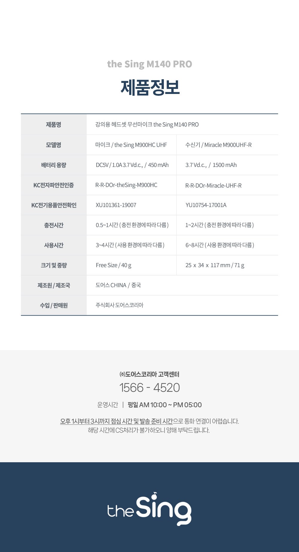 | 품명 및 모델명 | 더씽 UHF 강의용 무선 마이크 + 수신기 세트 / 마이크: the sing M900HC UHF, 수신기: Miracle M900UHF-R | KC 인증정보 | 마이크: R-R-DOr-theSing-M900HC | 마이크 전지: XU101361-19007A, | 수신기: R-R-DOr-Miracle-UHF-R | 수신기 전지: YU10754-17001A |
