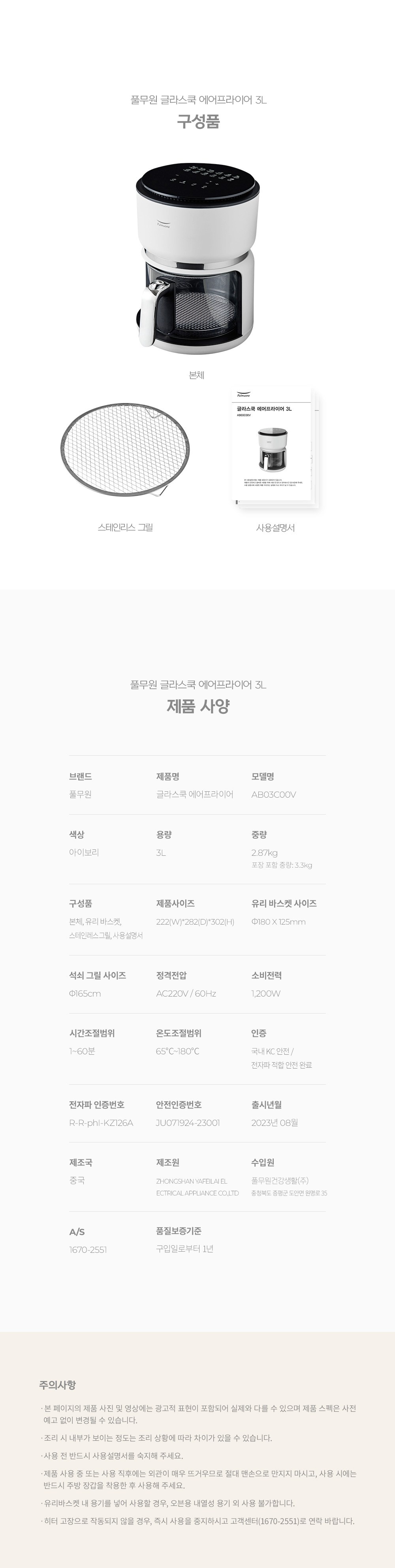 | 품명 및 모델명 | 주방용 전열기구와 유사한 기기(에어프라이어),AB03C00V | KC 인증정보 | JU071924-2300,R-R-phl-KZ126A |