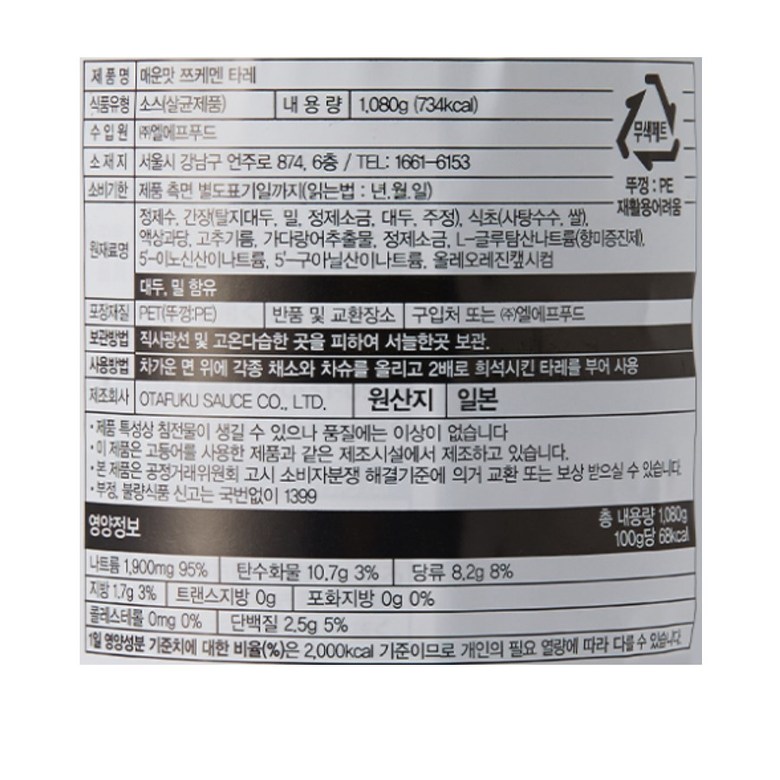 | 제조연월일, 소비기한 또는 품질유지기한 | 상품 상세페이지 참조 | 세부 품목군별 표시사항 | 상품 상세페이지 참조 |
