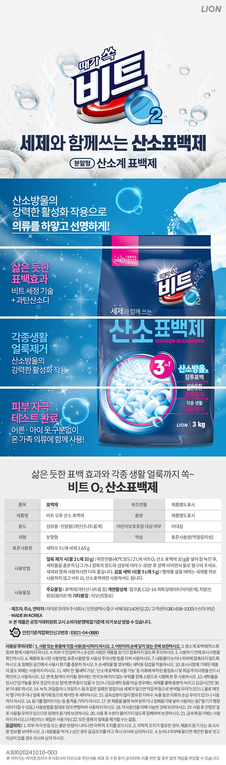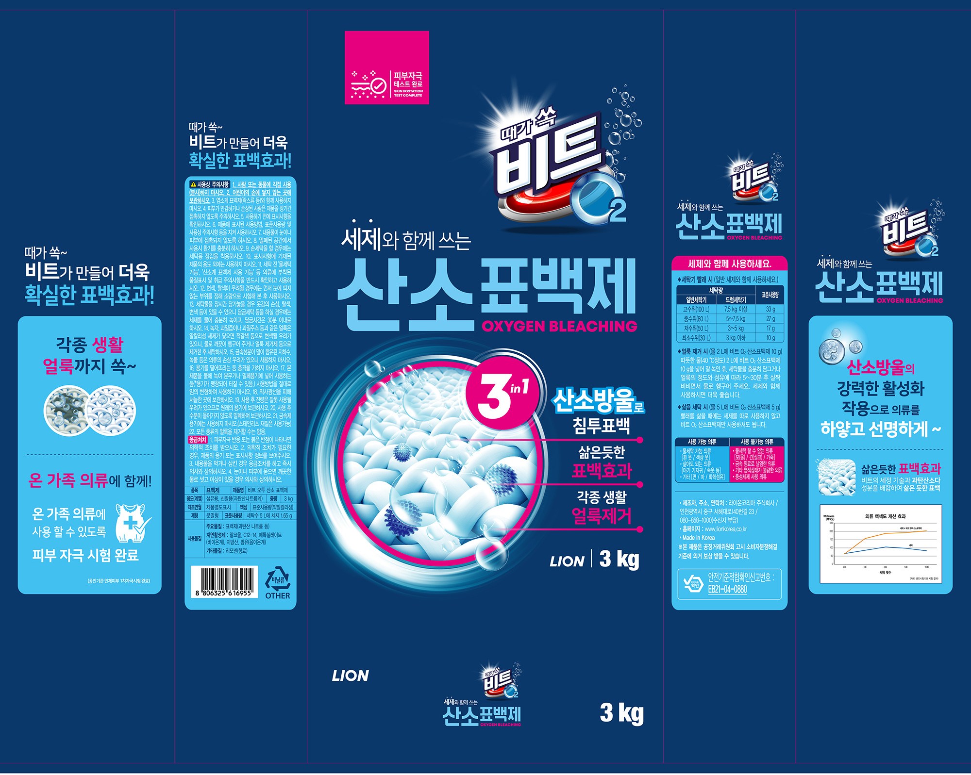 | 품목 및 제품명 | 표백제 / 비트 오투 산소표백제 | 용도(표백제의 경우 계열을 함께표시) 및 제형 | 섬유용, 신발용(과탄산나트륨계) / 분말형 |