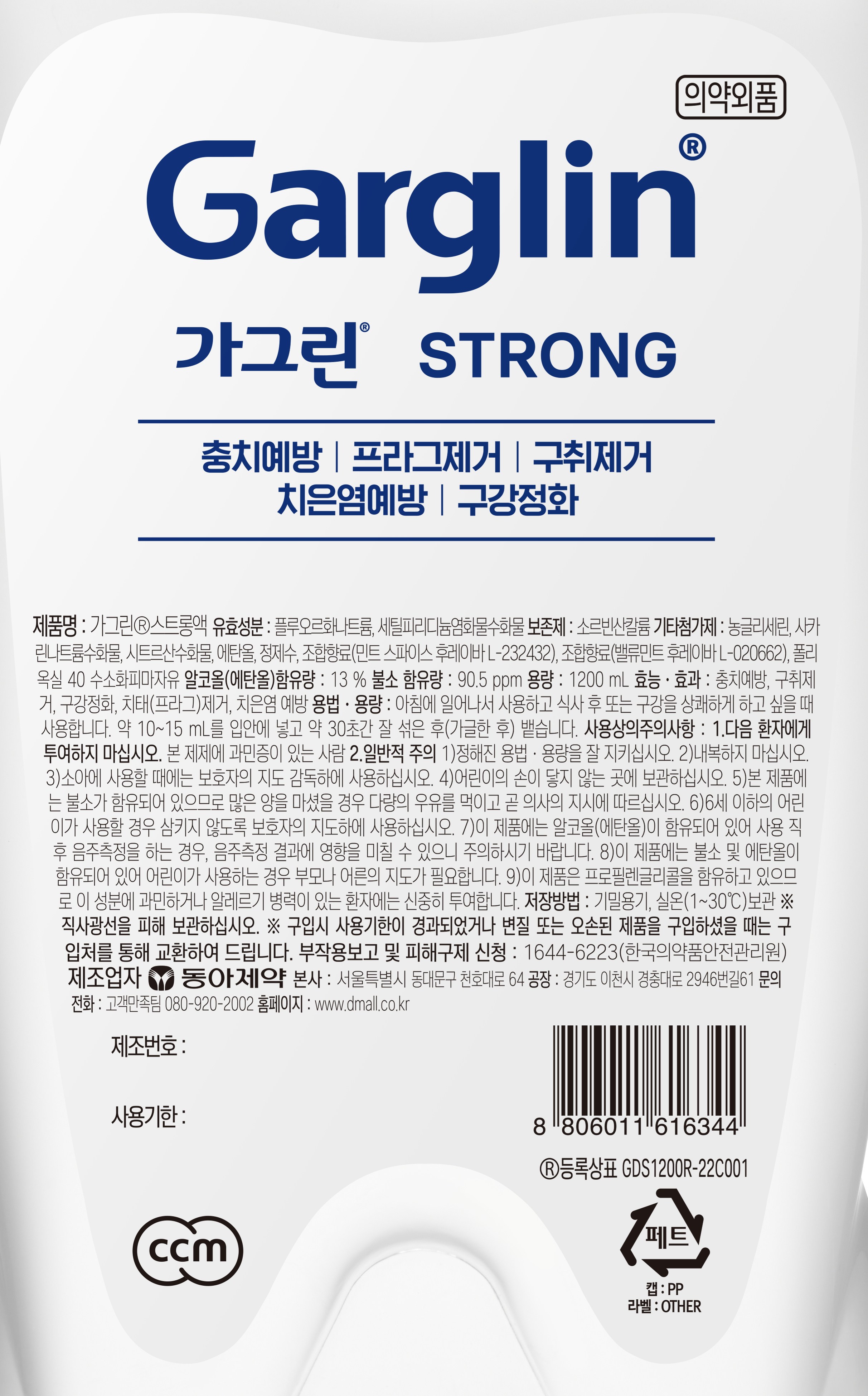 | 품명 및 모델명 | 가그린 스트롱액 | 인증/허가 사항 | 의약외품 |