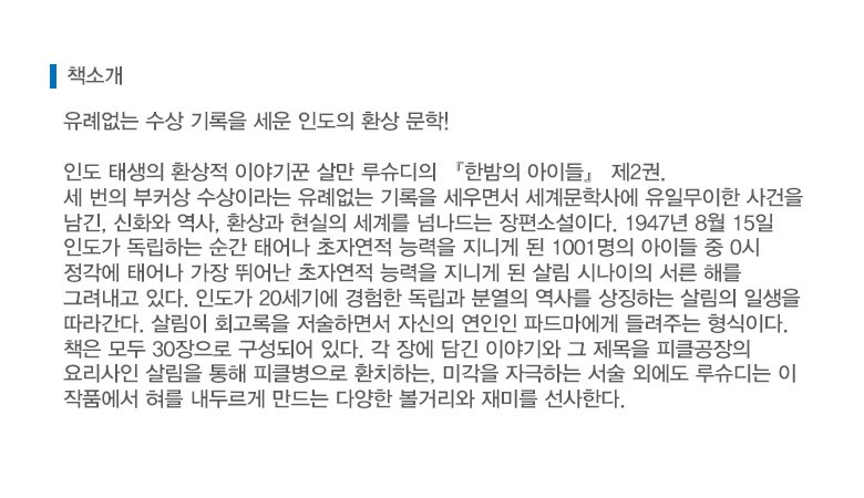 | 도서명 | 한밤의 아이들 2 (세계문학전집 080) | 저자, 출판사 | 살만 루슈디,문학동네 |