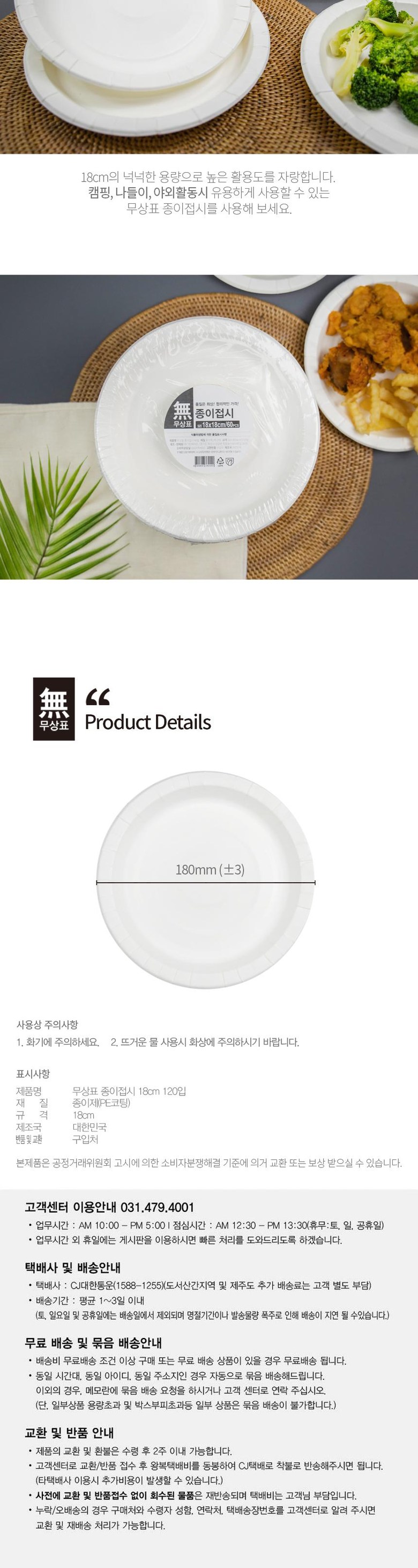 | 구성품 | 지름18cm 무지 종이접시 120매 | 크기 | 지름 18cm (±3%) |
