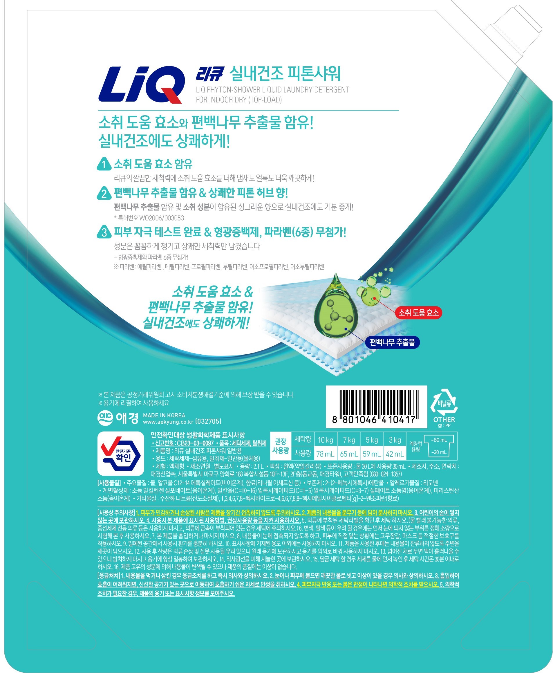 | 품목 및 제품명 | 탈취제,세탁세제 / 리큐 실내건조 피톤샤워 일반용 | 용도(표백제의 경우 계열을 함께표시) 및 제형 | 세탁세제-섬유용, 탈취제-일반용(물체용) / 리필형 |