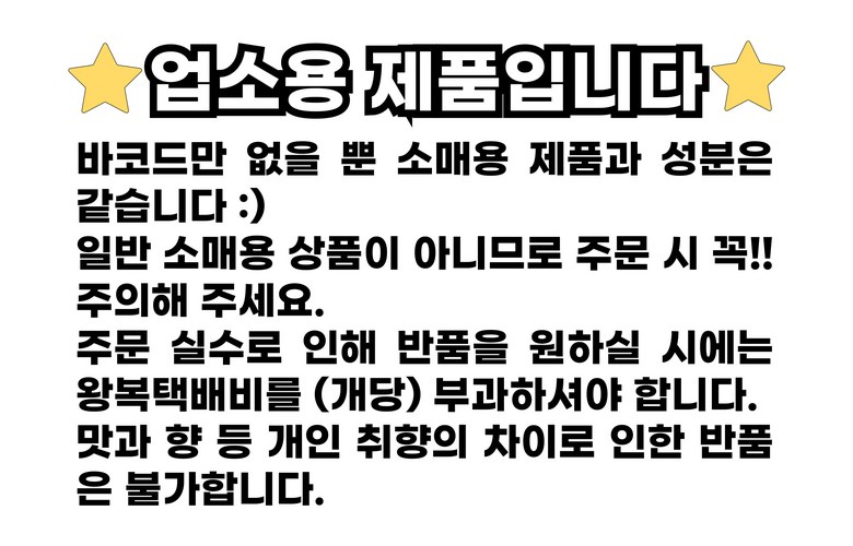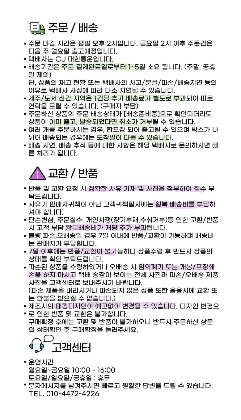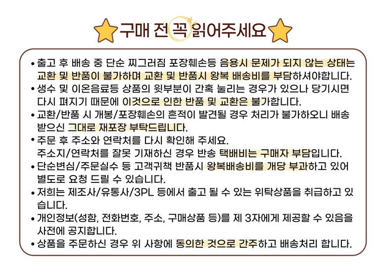 - ㆍ모니터 해상도의 차이로 인해 색상이나 이미지가 실제와 달라, 고객이 단순 변심으로 교환/반품을 무료로 요청하는 경우