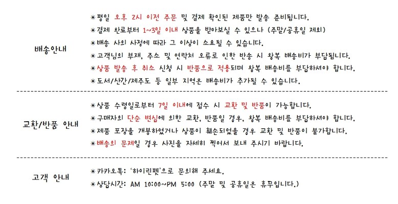 - ㆍ모니터 해상도의 차이로 인해 색상이나 이미지가 실제와 달라, 고객이 단순 변심으로 교환/반품을 무료로 요청하는 경우