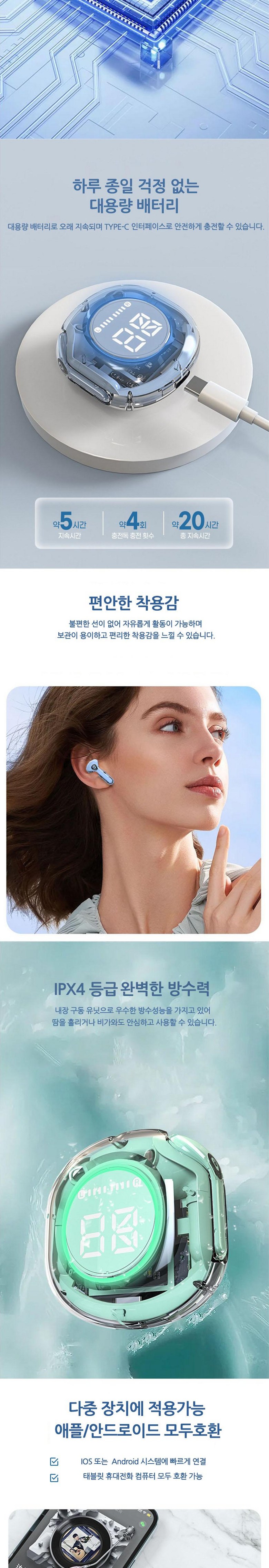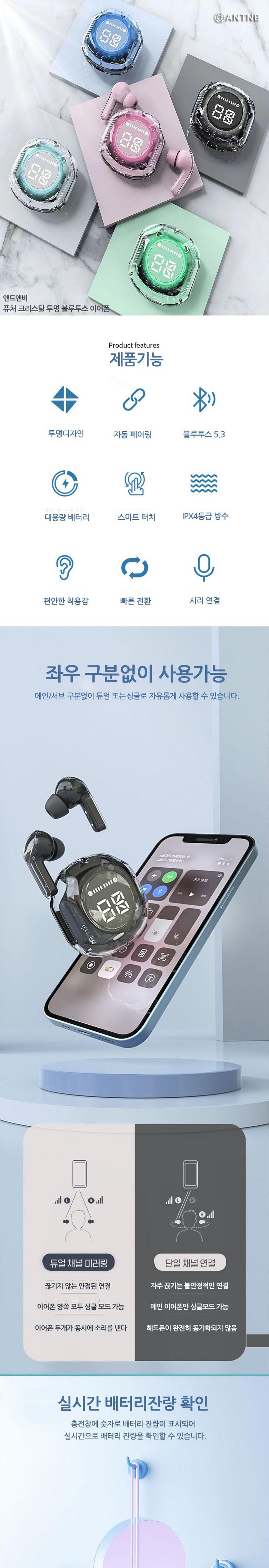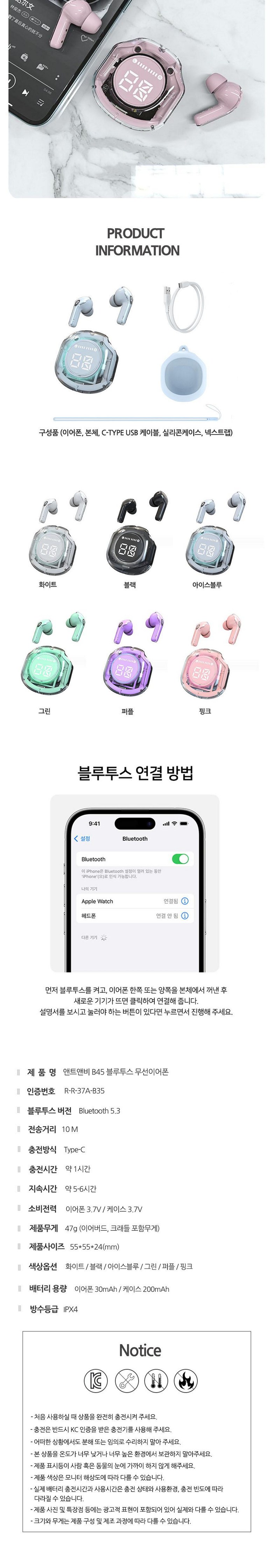 | 품명 및 모델명 | 앤트앤비 B45 투명 블루투스 이어폰 무선 이어폰 듀얼 노이즈 캔슬링 디지털 디스플레이 블루투스 5.3 | KC 인증정보 | R-R-37A-BTE / 이어폰전지 : XU101648-18001A / 크래들전지 : XU101040-18002A |