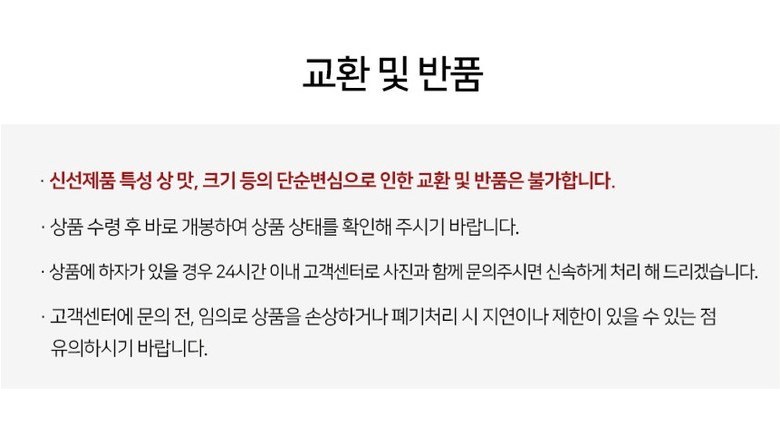 | 계절상품/식품/화장품 | ㆍ신선/냉장/냉동 상품의 단순변심의 경우 ㆍ뷰티 상품 이용 시 트러블(알러지, 붉은 반점, 가려움, 따가움)이 발생하는 경우, |