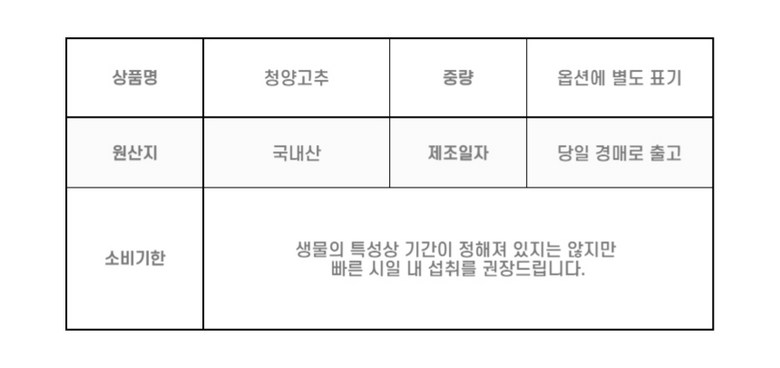 | 제조연월일, 소비기한 또는 품질유지기한 | 상품 상세페이지 참조 | 세부 품목군별 표시사항 | 상품 상세페이지 참조 |