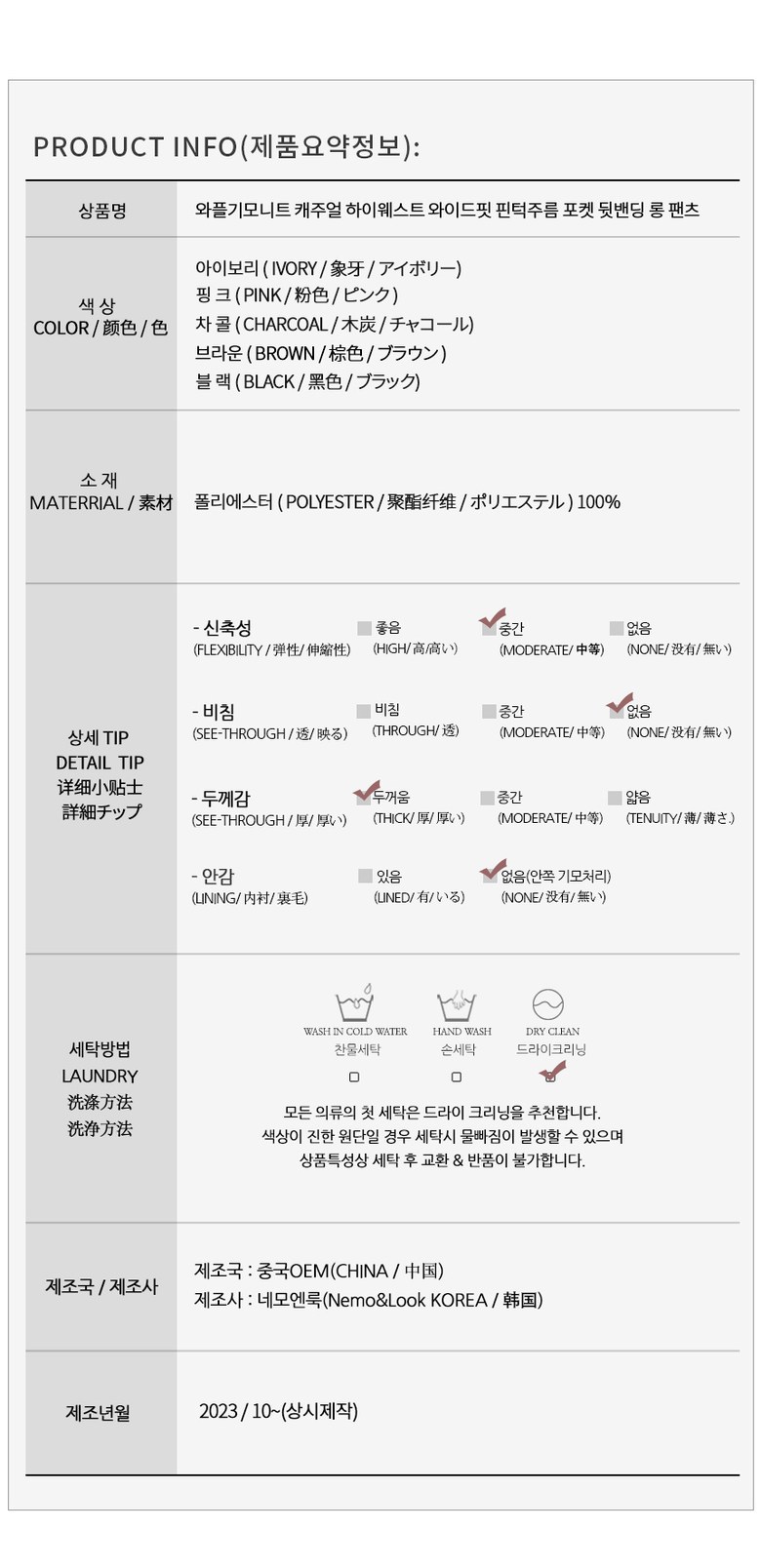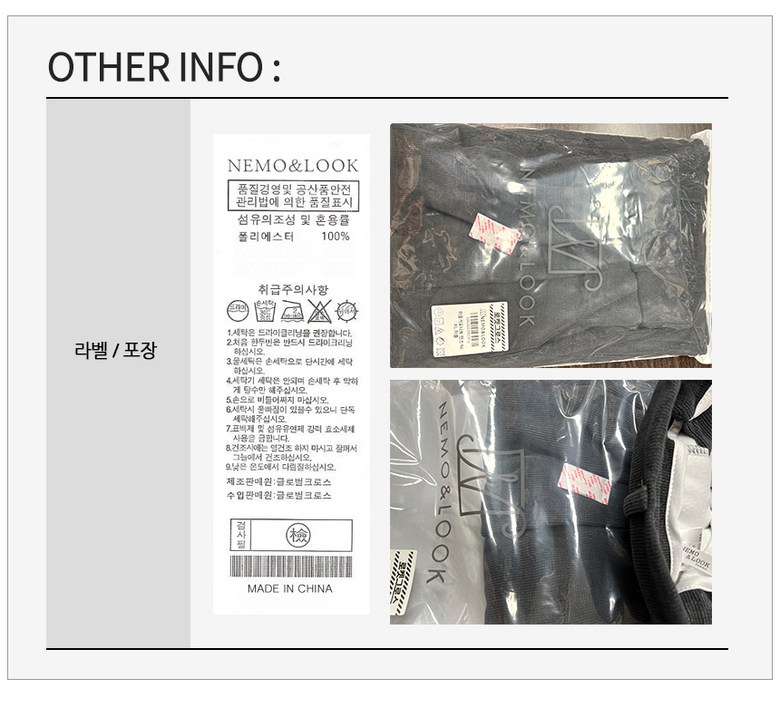 | 제조국 | 중국 | 세탁방법 및 취급시 주의사항 | 상품 상세페이지 참조 |