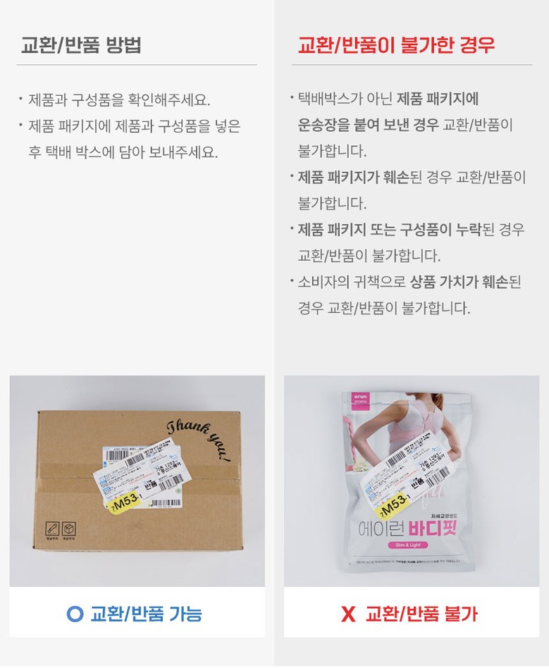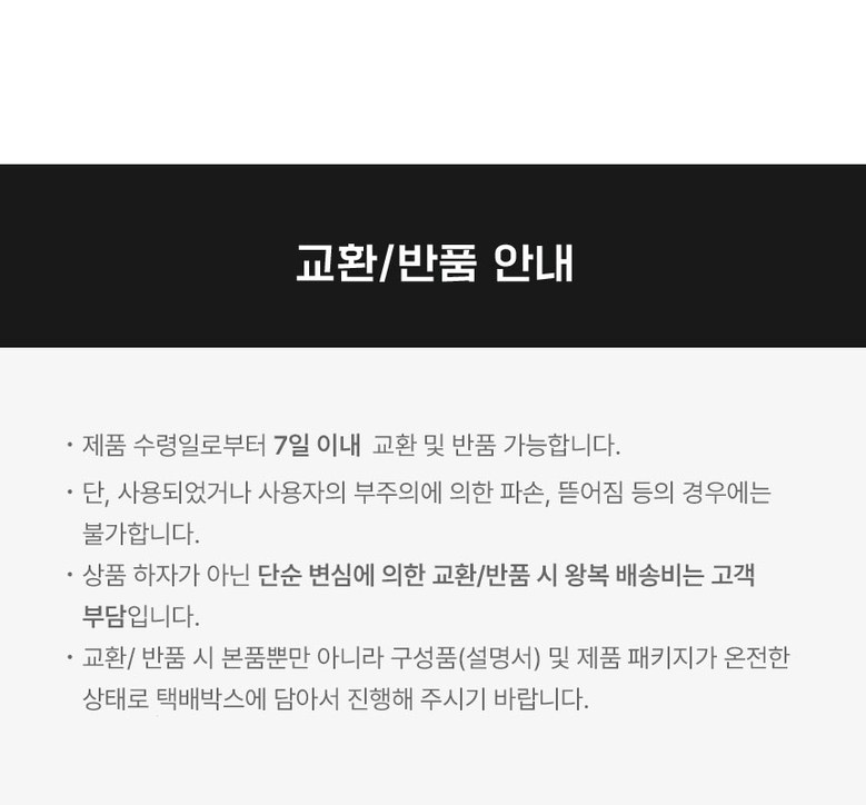 | 교환/반품 신청 기준일 | ㆍ단순변심에 의한 교환/반품은 제품 수령 후 7일 이내까지, 교환/반품 제한사항에 해당하지 않는 경우에만 가능 (배송비용과 교환/반품 비용 왕복배송비 고객부담) ㆍ상품의 내용이 표시·광고의 내용과 다른 경우에는 상품을 수령한 날부터 3개월 이내, 그 사실을 안 날 또는 알 수 있었던 날부터 |