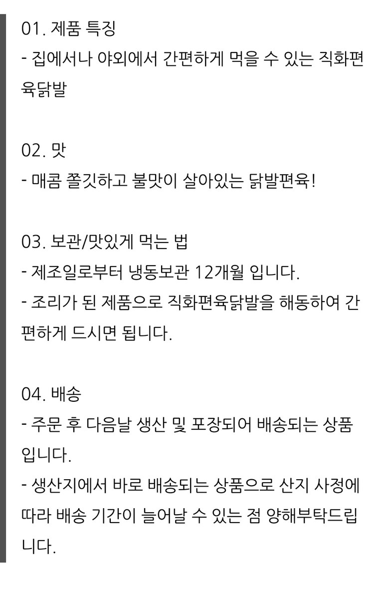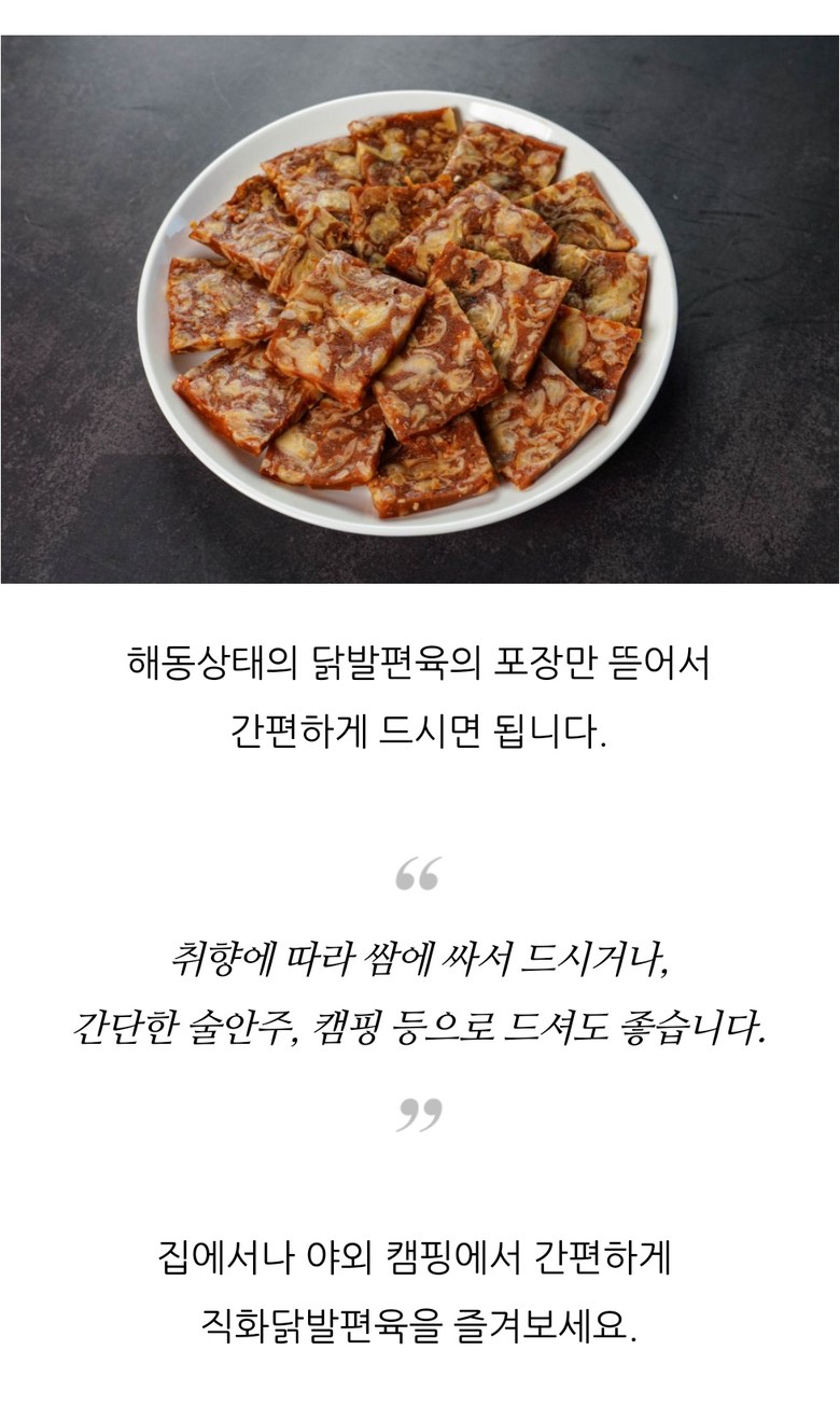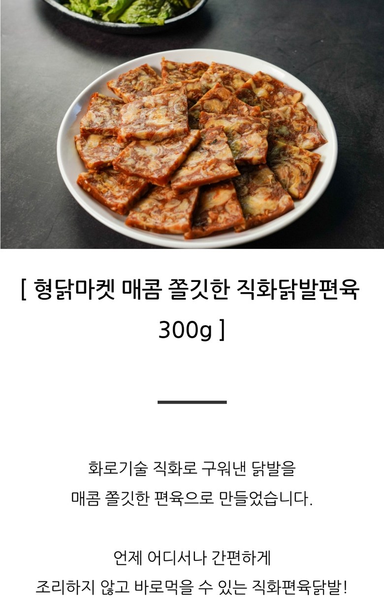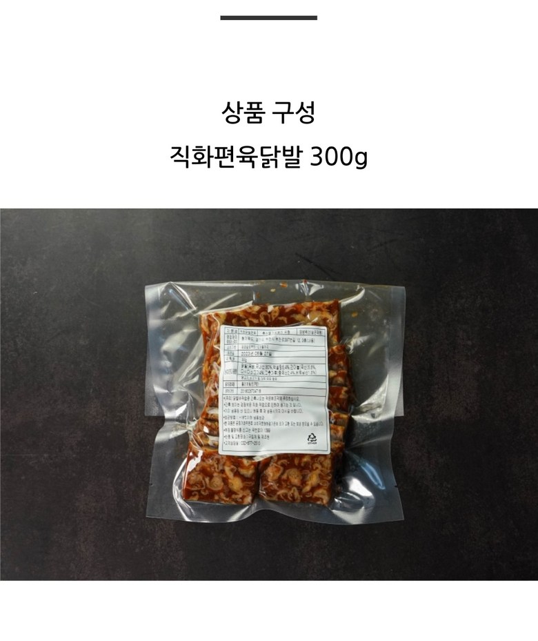 | 제품명 | 직화닭발편육 300g | 식품의 유형 | 양념육 |