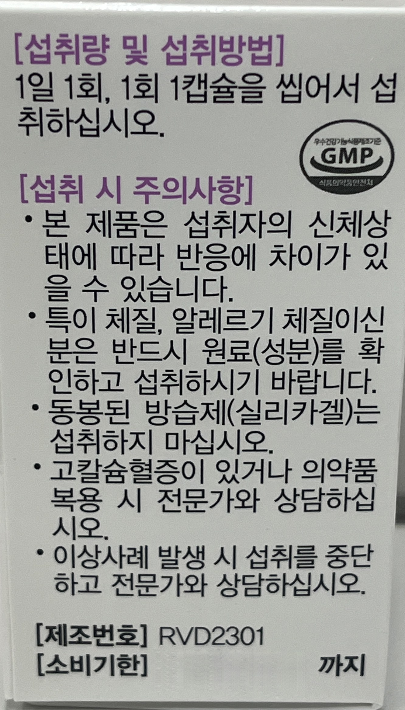 | 소비기한 및 보관방법 | 소비기한(또는 유통기한) : 2026년 05월 22일 이거나 그 이후인 상품<br />제조년월일 : 2024년 05월 23일 이후인 제조상품<br />보관방법: 컨텐츠 참조 | 포장단위별 내용물의 용량(중량), 수량 | 60정 x 2개 |