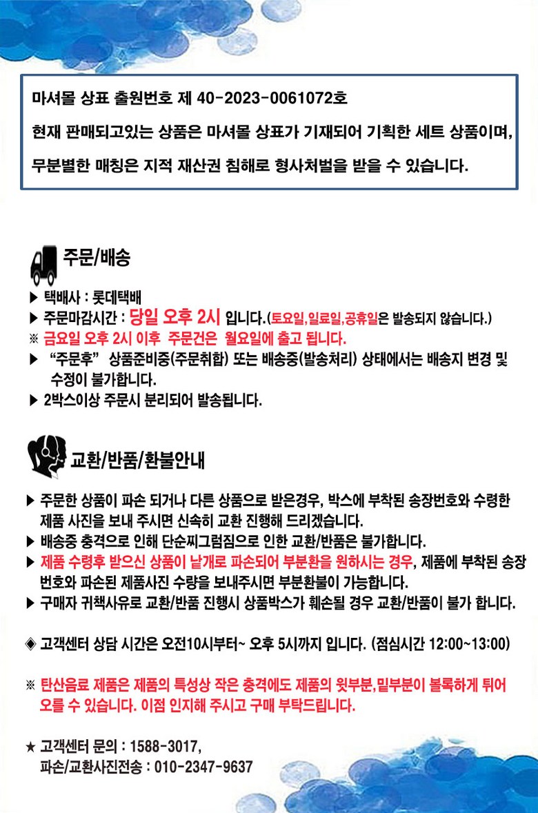 - ㆍ교환/반품에 관한 일반적인 사항은 판매자가 제시사항보다 관계법령이 우선합니다.
