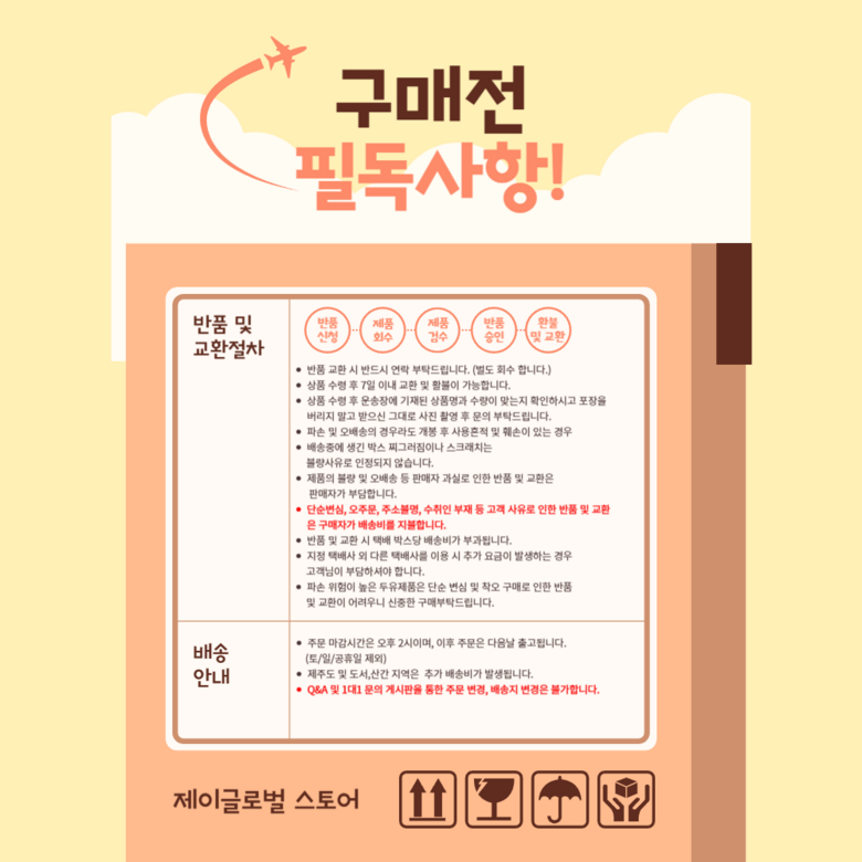 - ㆍ모니터 해상도의 차이로 인해 색상이나 이미지가 실제와 달라, 고객이 단순 변심으로 교환/반품을 무료로 요청하는 경우
