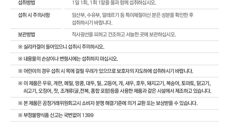 | 제조연월일, 소비기한 또는 품질유지기한 | 상품 상세페이지 참조 | 세부 품목군별 표시사항 | 상품 상세페이지 참조 |