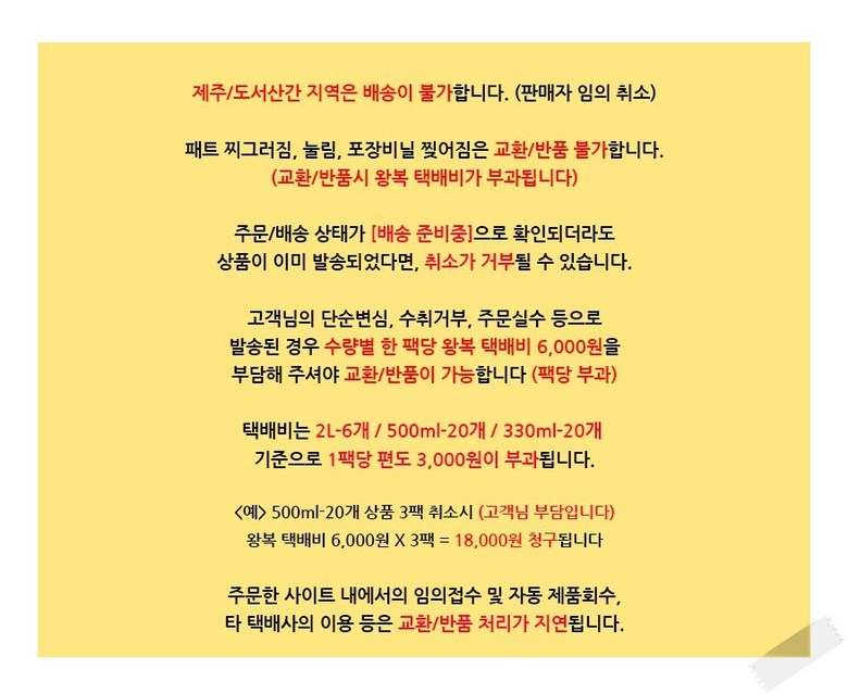 - ㆍ모니터 해상도의 차이로 인해 색상이나 이미지가 실제와 달라, 고객이 단순 변심으로 교환/반품을 무료로 요청하는 경우
