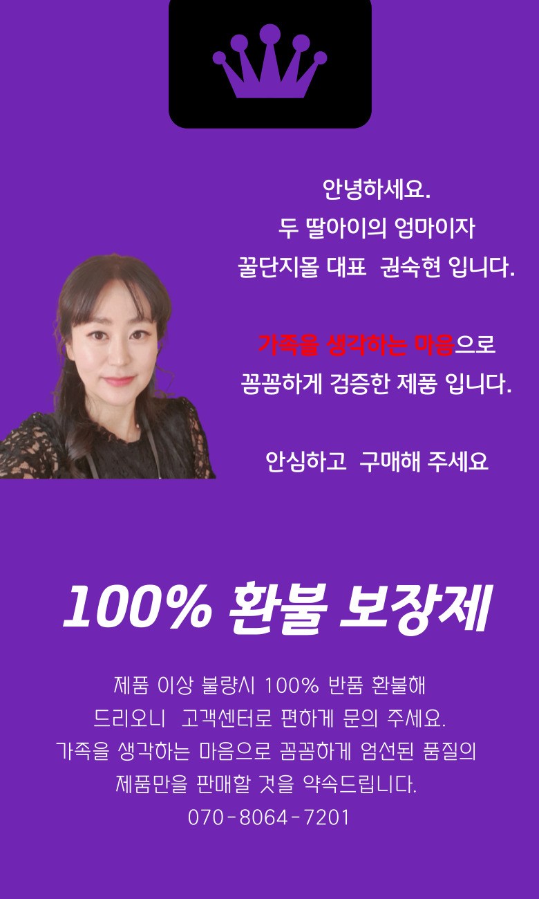 - ㆍ모니터 해상도의 차이로 인해 색상이나 이미지가 실제와 달라, 고객이 단순 변심으로 교환/반품을 무료로 요청하는 경우
