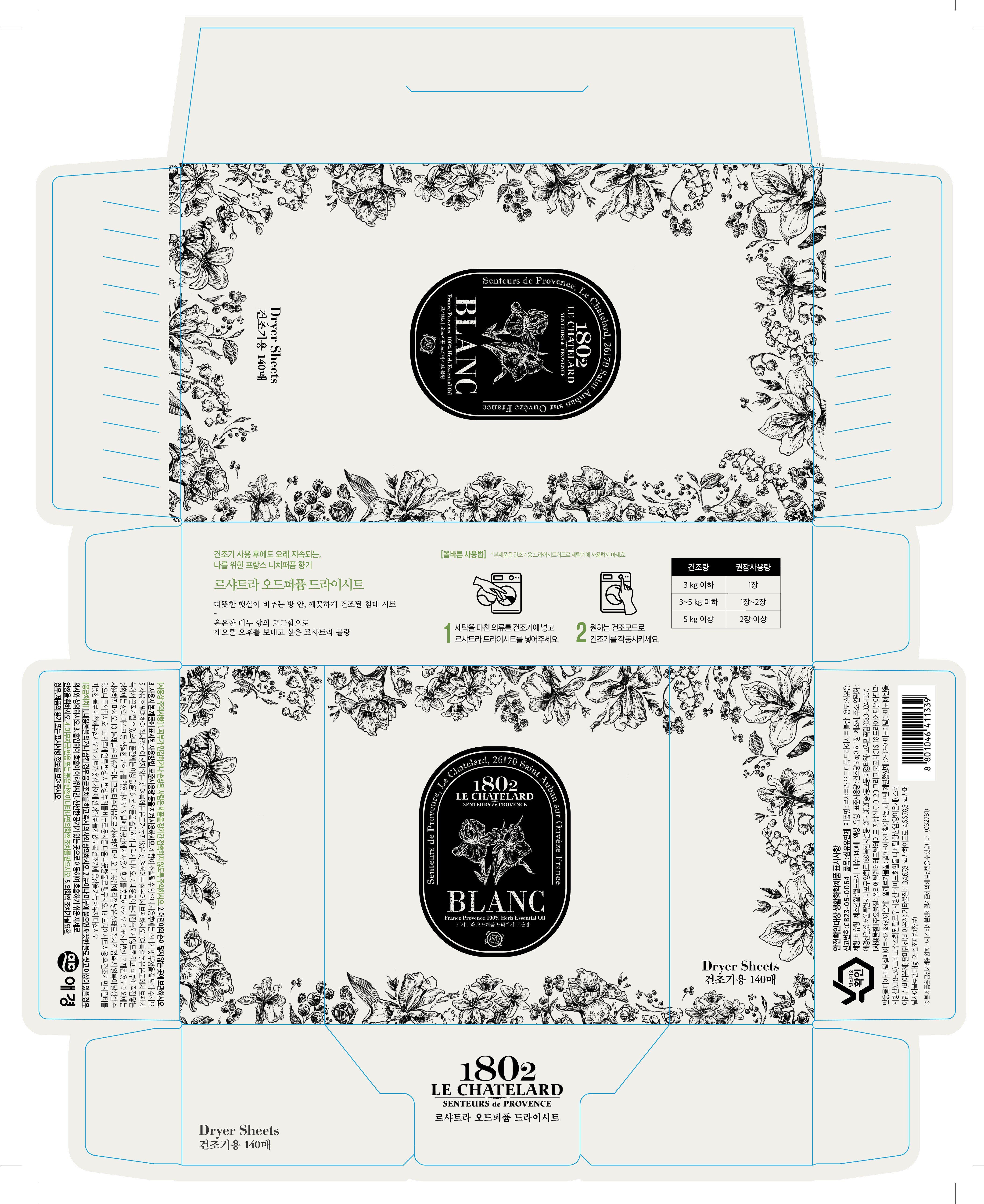 | 품목 및 제품명 | 섬유유연제 / 르샤트라 오드퍼퓸 드라이시트 블랑 | 용도(표백제의 경우 계열을 함께표시) 및 제형 | 섬유용 / 티슈용 |