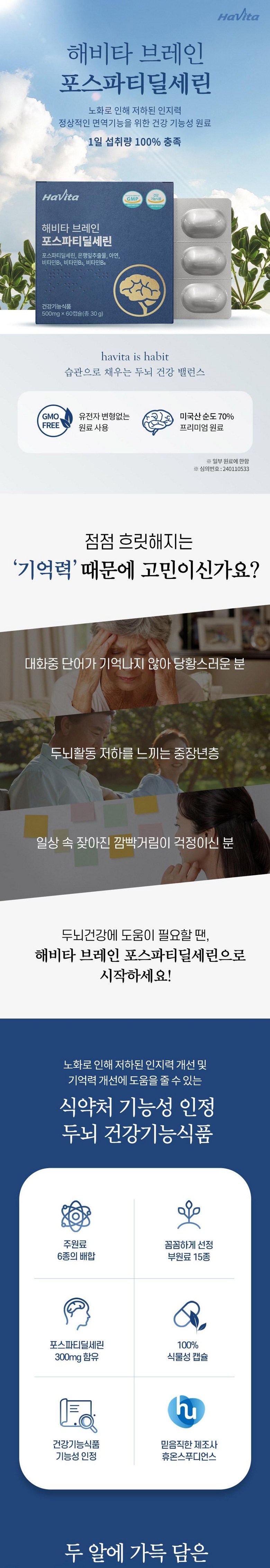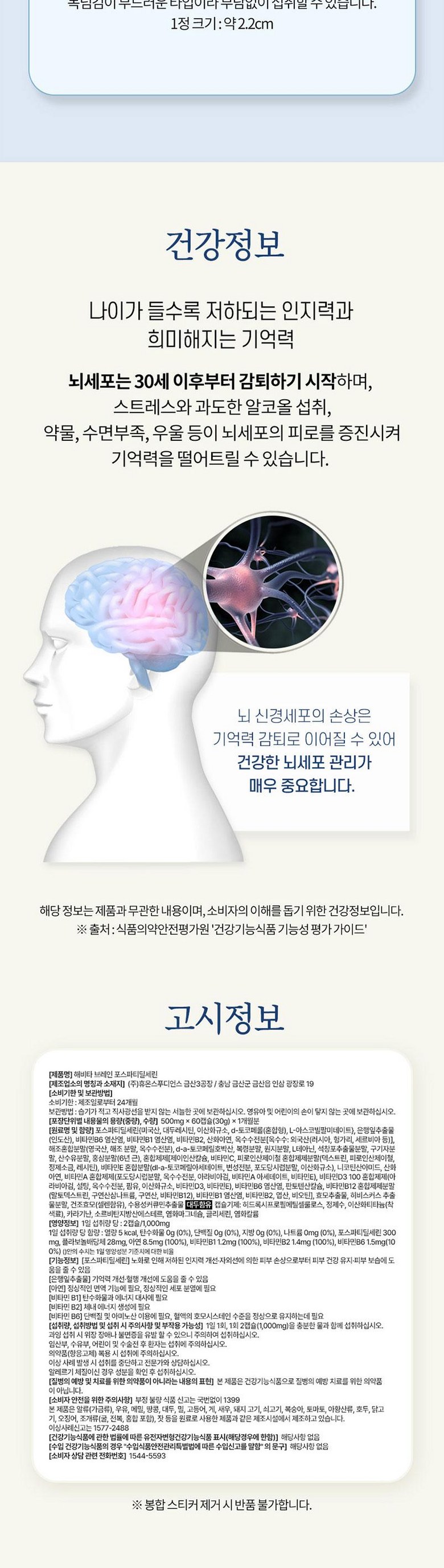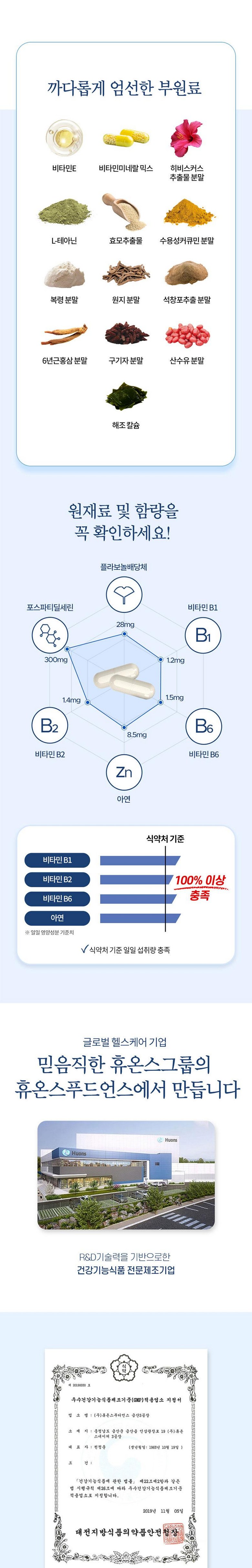 | 원료명 및 함량 | 포스파티딜세린{미국산, 대두레시틴, 이산화규소, d-토코페롤(혼합형), L-아스코빌팔미테이트}, 은행잎추출물(인도산), 비타민B6 염산염, 비타민B1 염산염, 비타민B2, 산화아연, 옥수수전분[옥수수: 외국산(러시아, 헝가리, 세르비아 등)], 해조혼합분말(영국산, 해조분말, 옥수수전분), d-a-토코페릴호박산, 복령분말, 원지분말, L테아닌, 석창포추출물분말, 구기자분말, 산수유분말, 홍삼분말(6년 근), 혼합제제[제이인산칼슘, 비타민C, 피로인산제이철 혼합제제분말(덱스트린, 피로인산제이철, 정제소금, 레시틴), 비타민E 혼합분말(dl-a-토코페릴아세테이트, 변성전분, 포도당시럽분말, 이산화규소), 니코틴산아미드, 산화아연, 비타민A 혼합제제(포도당시럽분말, 옥수수전분, 아라비아검, 비타민A 아세테이트, 비타민E), 비타민D3 100 혼합제제(아라비아검, 설탕, 옥수수전분, 팜유, 이산화규소, 비타민D3, 비타민E), 비타민B6 염산염, 판토텐산칼슘, 비타민B12 혼합제제분말(말토덱스트린, 구연산삼나트륨, 구연산, 비타민B12), 비타민B1 염산염, 비타민B2, 엽산, 비오틴], 효모추출물, 히비스커스 추출물분말, 건조효모(셀렌함유), 수용성커큐민추출물 [대두함유] 캡슐기제: 히드록시프로필메틸셀룰로스, 정제수, 이산화티타늄(착색료), 카라기난, 소르비탄지방산에스테르, 염화마그네슘, 글리세린, 염화칼륨 | 영양정보 | 1일 섭취량 당 : 2캡슐/1,000mg 1일 섭취량 당 함량: 열량 5 kcal, 탄수화물 0g (0%), 단백질 0g (0%), 지방 0g (0%), 나트륨 0mg (0%), 포스파티딜세린 300mg, 플라보놀배당체 28mg, 아연 8.5mg (100%), 비타민B1 1.2mg (100%), 비타민B2 1.4mg (100%), 비타민B6 1.5mg(100%) ()안의 수치는 1일 영양성분 기준치에 대한 비율 |