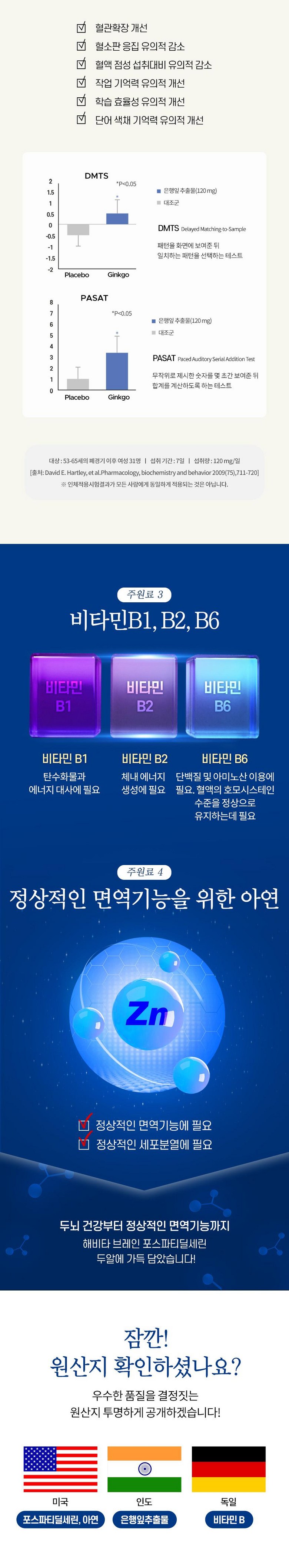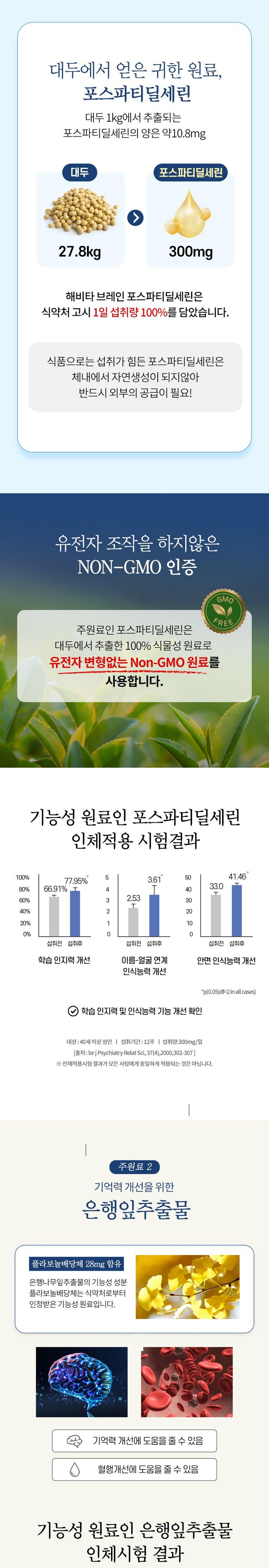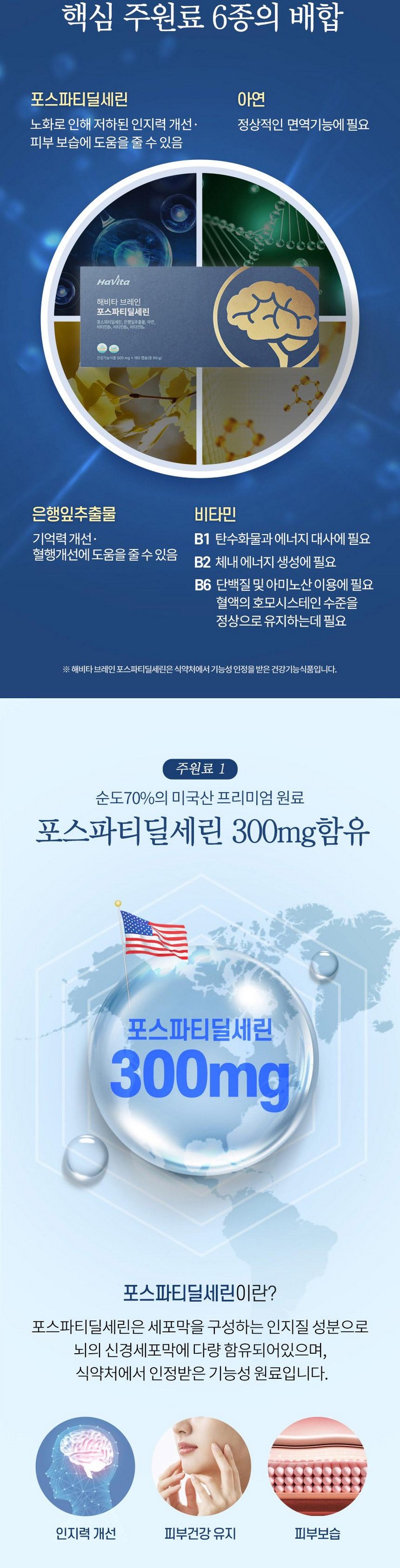 | 원료명 및 함량 | 포스파티딜세린{미국산, 대두레시틴, 이산화규소, d-토코페롤(혼합형), L-아스코빌팔미테이트}, 은행잎추출물(인도산), 비타민B6 염산염, 비타민B1 염산염, 비타민B2, 산화아연, 옥수수전분[옥수수: 외국산(러시아, 헝가리, 세르비아 등)], 해조혼합분말(영국산, 해조분말, 옥수수전분), d-a-토코페릴호박산, 복령분말, 원지분말, L테아닌, 석창포추출물분말, 구기자분말, 산수유분말, 홍삼분말(6년 근), 혼합제제[제이인산칼슘, 비타민C, 피로인산제이철 혼합제제분말(덱스트린, 피로인산제이철, 정제소금, 레시틴), 비타민E 혼합분말(dl-a-토코페릴아세테이트, 변성전분, 포도당시럽분말, 이산화규소), 니코틴산아미드, 산화아연, 비타민A 혼합제제(포도당시럽분말, 옥수수전분, 아라비아검, 비타민A 아세테이트, 비타민E), 비타민D3 100 혼합제제(아라비아검, 설탕, 옥수수전분, 팜유, 이산화규소, 비타민D3, 비타민E), 비타민B6 염산염, 판토텐산칼슘, 비타민B12 혼합제제분말(말토덱스트린, 구연산삼나트륨, 구연산, 비타민B12), 비타민B1 염산염, 비타민B2, 엽산, 비오틴], 효모추출물, 히비스커스 추출물분말, 건조효모(셀렌함유), 수용성커큐민추출물 [대두함유] 캡슐기제: 히드록시프로필메틸셀룰로스, 정제수, 이산화티타늄(착색료), 카라기난, 소르비탄지방산에스테르, 염화마그네슘, 글리세린, 염화칼륨 | 영양정보 | 1일 섭취량 당 : 2캡슐/1,000mg 1일 섭취량 당 함량: 열량 5 kcal, 탄수화물 0g (0%), 단백질 0g (0%), 지방 0g (0%), 나트륨 0mg (0%), 포스파티딜세린 300mg, 플라보놀배당체 28mg, 아연 8.5mg (100%), 비타민B1 1.2mg (100%), 비타민B2 1.4mg (100%), 비타민B6 1.5mg(100%) ()안의 수치는 1일 영양성분 기준치에 대한 비율 |