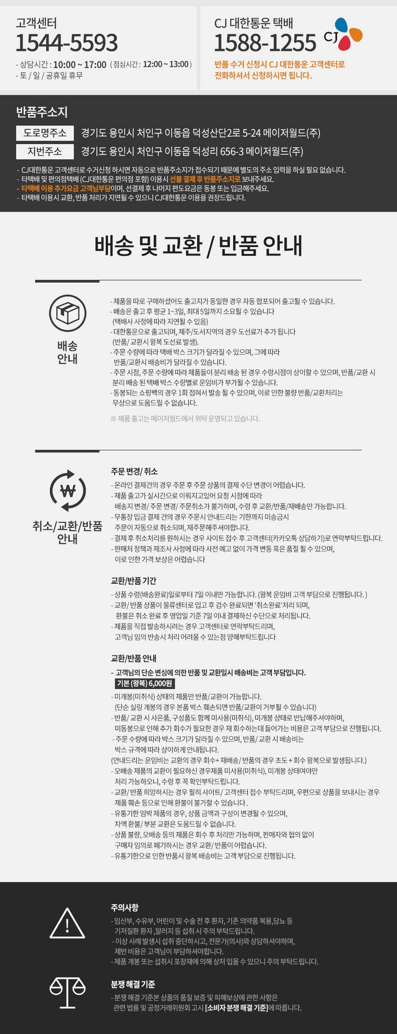 - ㆍ교환/반품에 관한 일반적인 사항은 판매자가 제시사항보다 관계법령이 우선합니다.