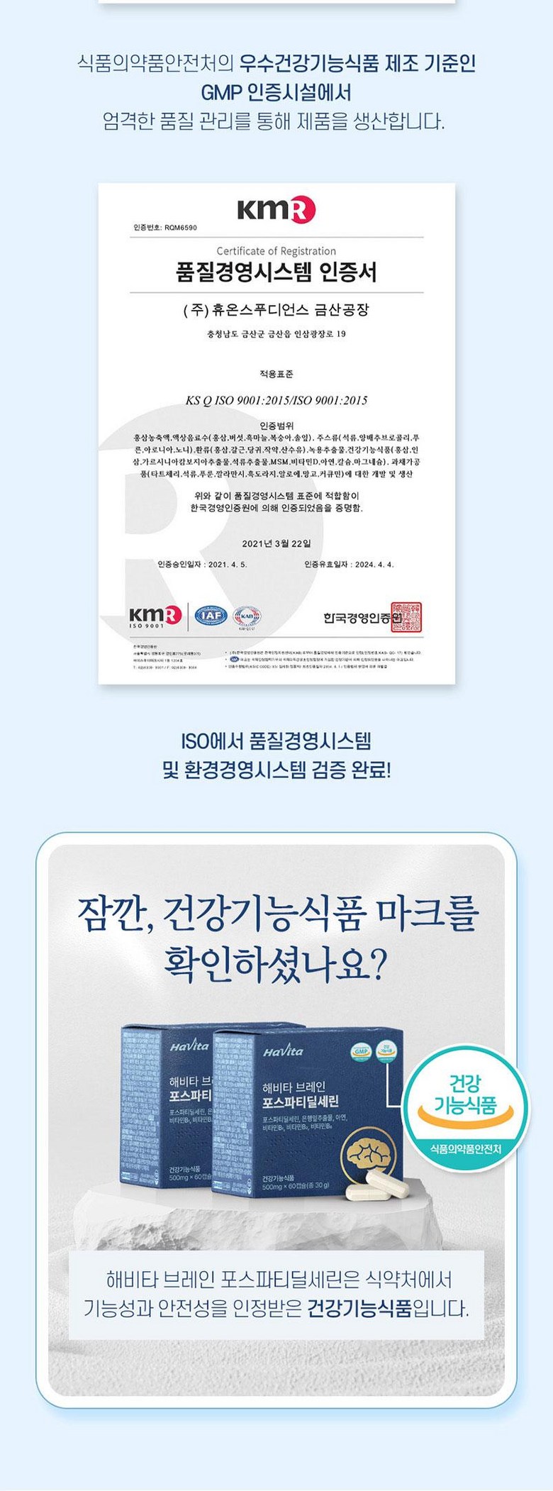 | 제품명 | 해비타 브레인 포스파티딜세린 | 제조업소의 명칭과 소재지 | (주)휴온스푸디언스 금산3공장 / 충남 금산군 금산읍 인삼 광장로 19 |