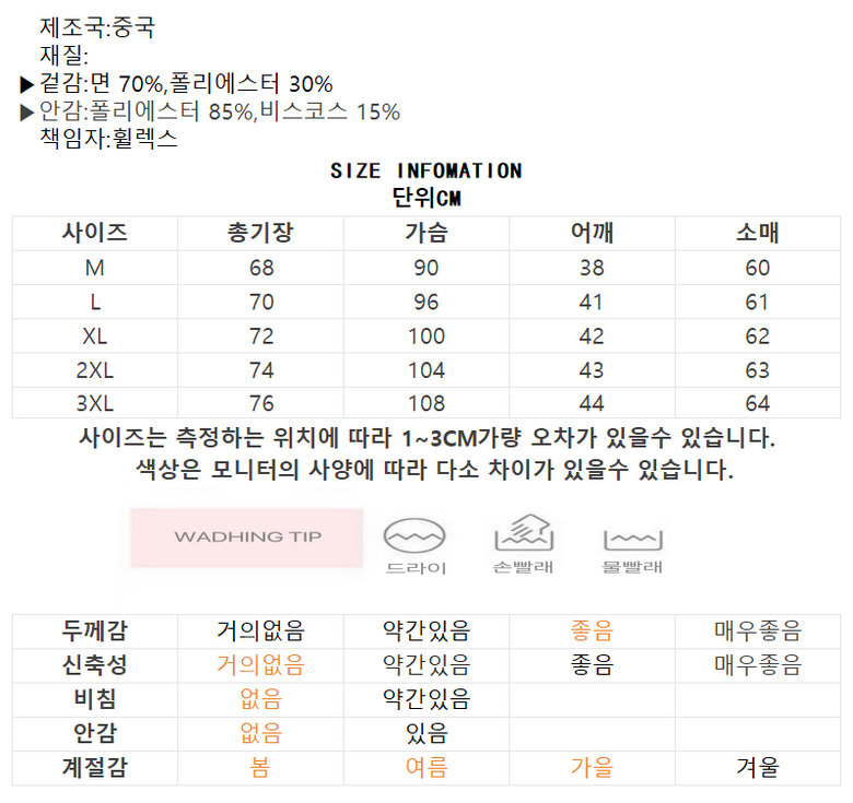 | 제조국 | 중국 | 세탁방법 및 취급시 주의사항 | 소재 특성상 단독 세탁을 권장하며, 장시간 물에 담가두지 마십시오. 표백제 및 건조기 사용을 금합니다. |
