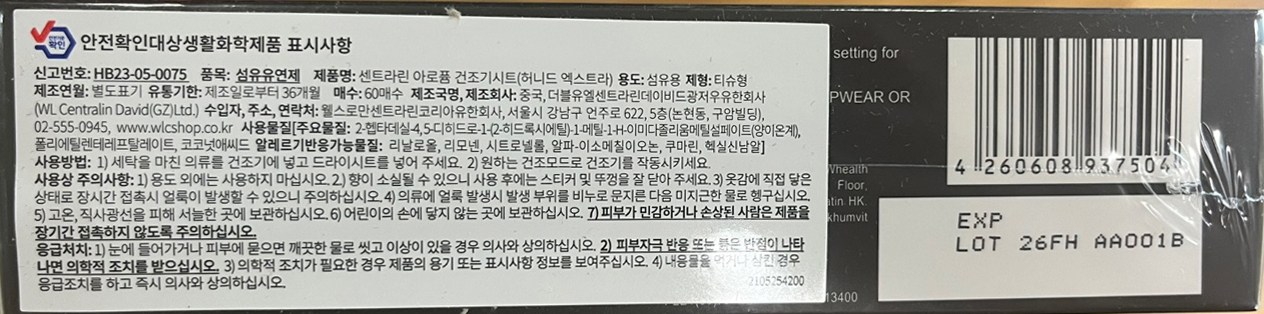 | 품목 및 제품명 | 섬유유연제 / 센트라린 아로퓸 건조기시트(허니드 엑스트라) | 용도(표백제의 경우 계열을 함께표시) 및 제형 | 섬유용 / 티슈형 |