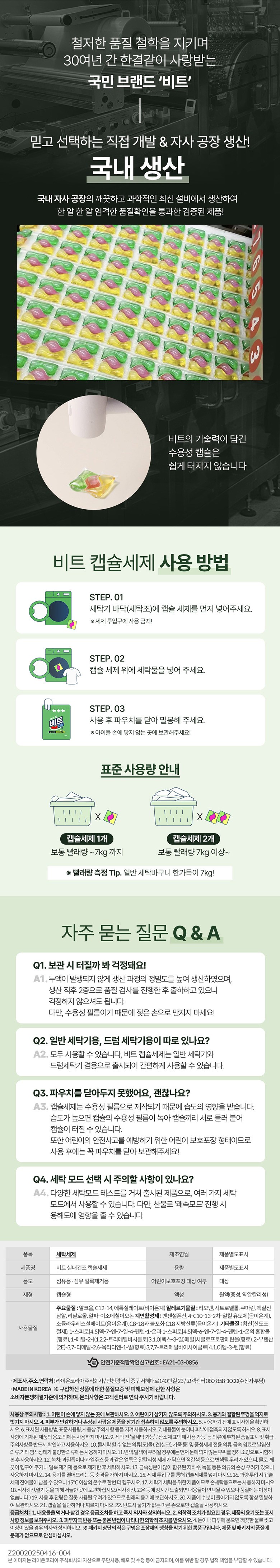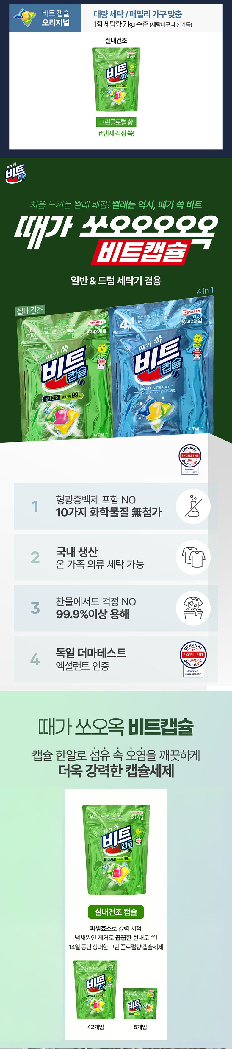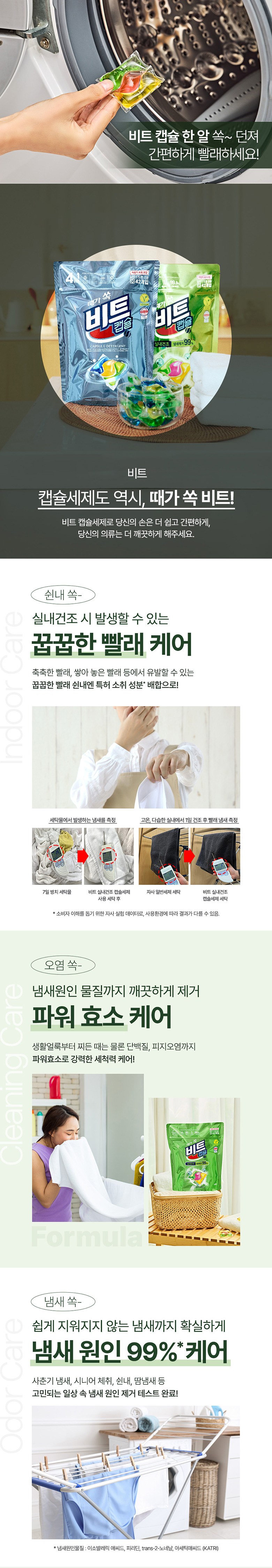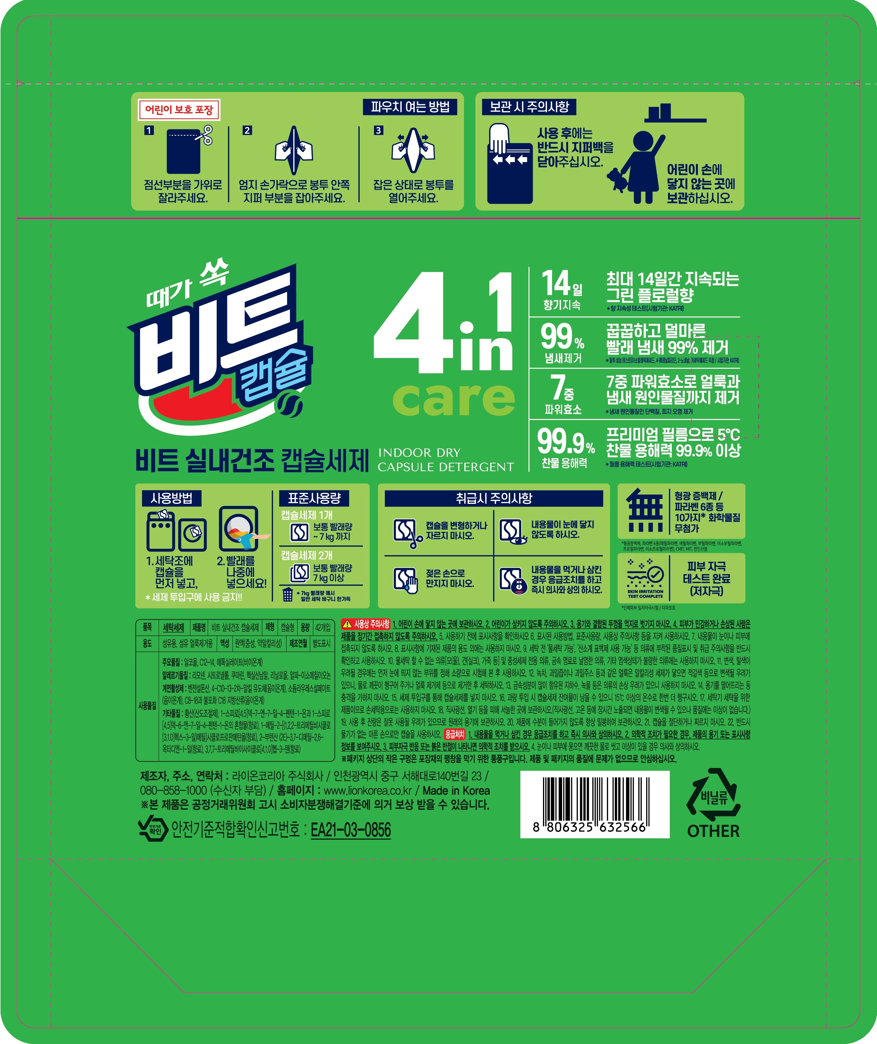 | 품목 및 제품명 | 세탁세제 / 비트 실내건조 캡슐세제 | 용도(표백제의 경우 계열을 함께표시) 및 제형 | 섬유용, 섬유 얼룩제거용 / 캡슐형 |