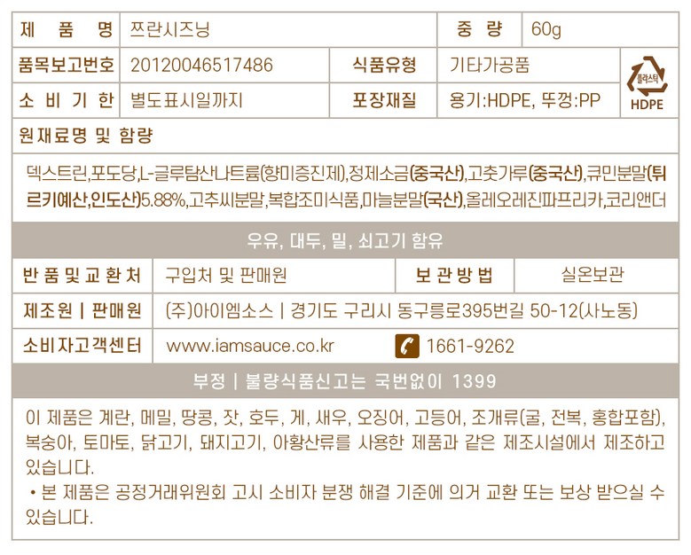 | 포장단위별 내용물의 용량(중량), 수량 | 60g | 원재료명 및 함량 | 덱스트린,포도당,L-글루탐산나트륨(향미증진제),정제소금(중국산),고춧가루(중국산),큐민분말(튀르키예산)5.88%,고추씨분말,복합조미식품,마늘분말(국산),올레오레진파프리카,코리앤더 |