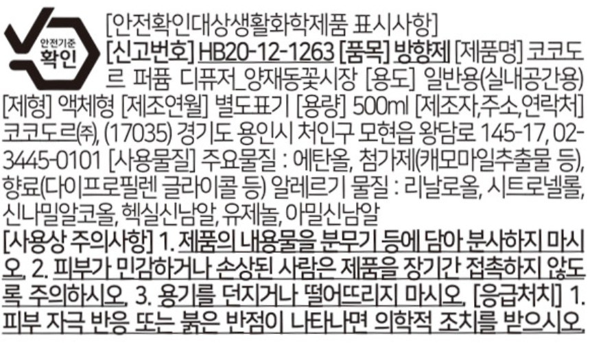 | 품목 및 제품명 | 방향제 / 코코도르 퍼퓸 디퓨저_양재동꽃시장 | 용도(표백제의 경우 계열을 함께표시) 및 제형 | 일반용(실내공간용) / 액체형 |