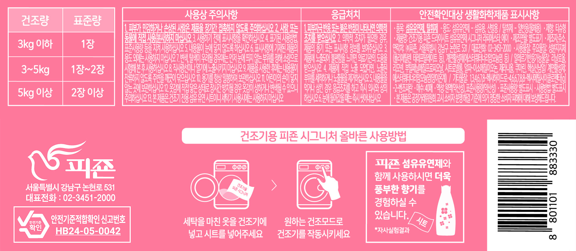 | 품목 및 제품명 | 섬유유연제, 탈취제 / 건조기용 피죤 드라이시트 섬유유연제 시그니처 라피에스타_에이 | 용도(표백제의 경우 계열을 함께표시) 및 제형 | 섬유용,신발용,일반용(물체용) / 티슈형 |