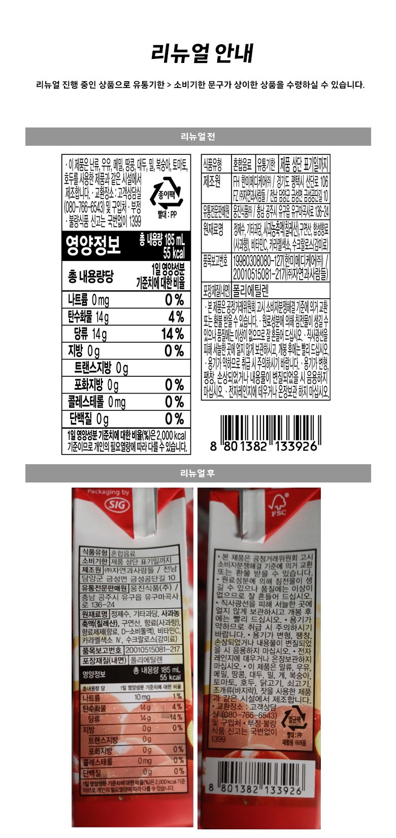 | 포장단위별 내용물의 용량(중량), 수량 | 185ml, 120개 | 원재료명 및 함량 | 컨텐츠참조 |