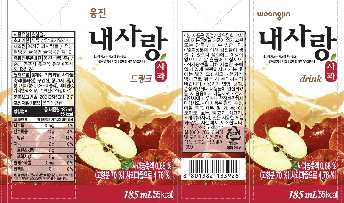 | 제품명 | 내사랑 사과 드링크 | 식품의 유형 | 컨텐츠 참조 |