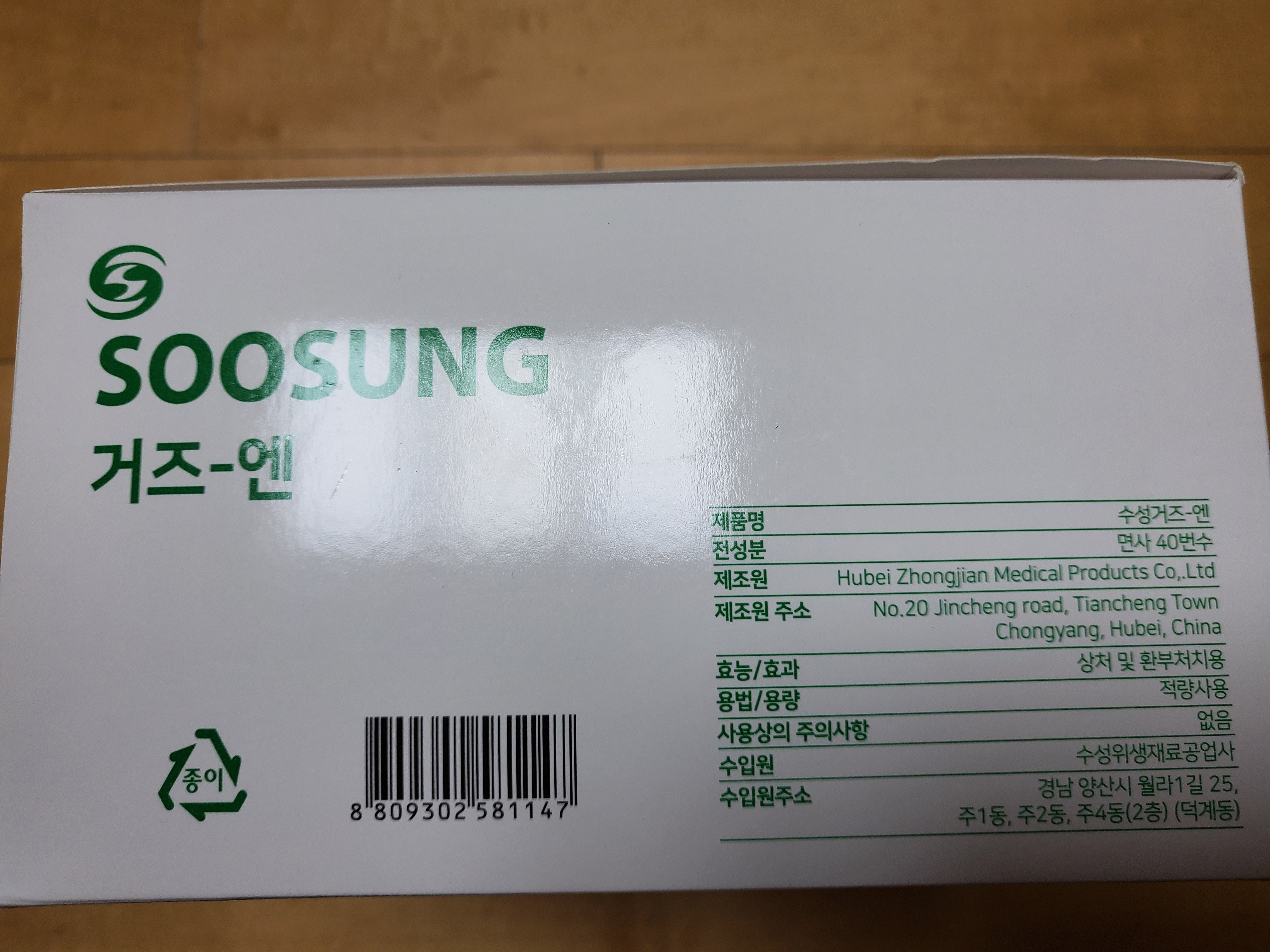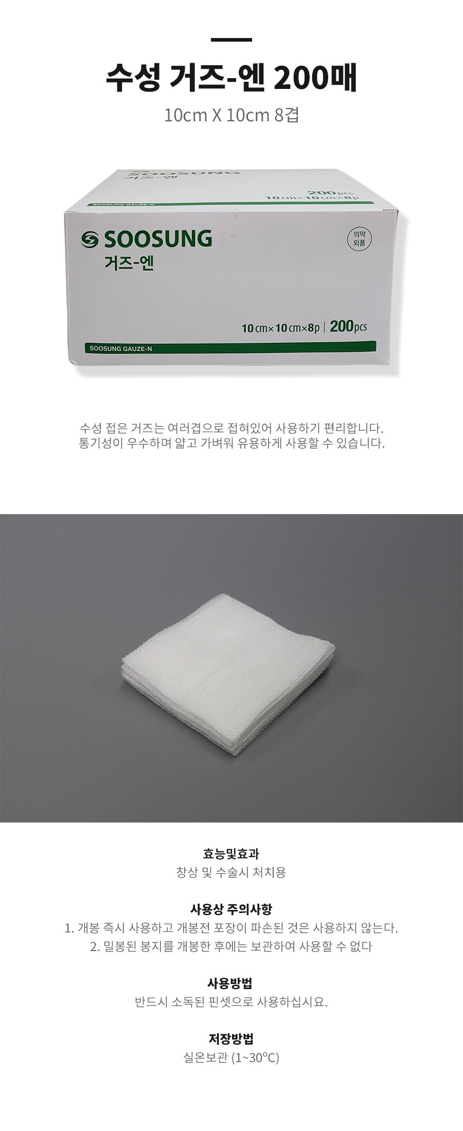 | 품명 및 모델명 | 수성거즈-엔 10cm x 10cm x 8겹 200매 | 인증/허가 사항 | 의약외품 |