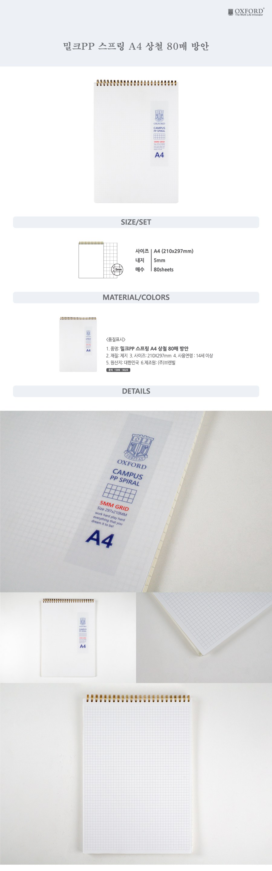 | 품명 및 모델명 | OXFORD 밀크PP 절취스프링 방안 노트 상철 A4 80매 | 인증/허가 사항 | 해당없음(14세이상) |
