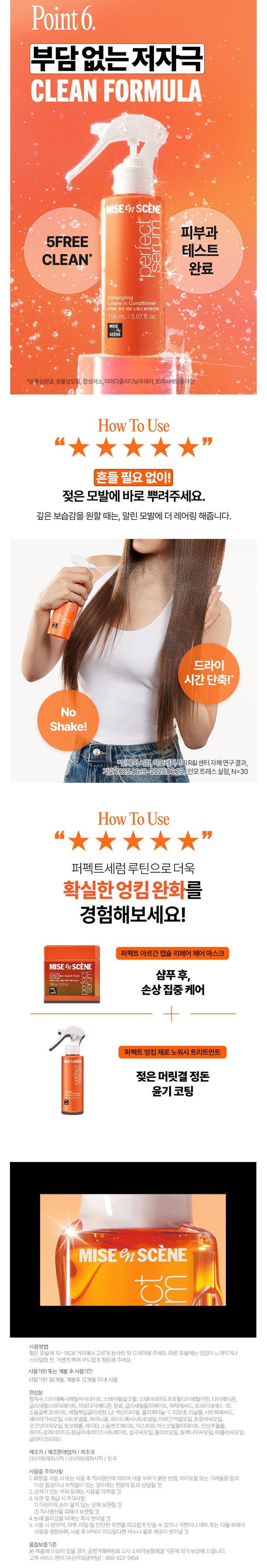 | 용량(중량) | 미쟝센 퍼펙트 엉킴제로 노워시 트리트먼트 150ml | 제품 주요 사양 | 엉킴제로/모든 피부용 |