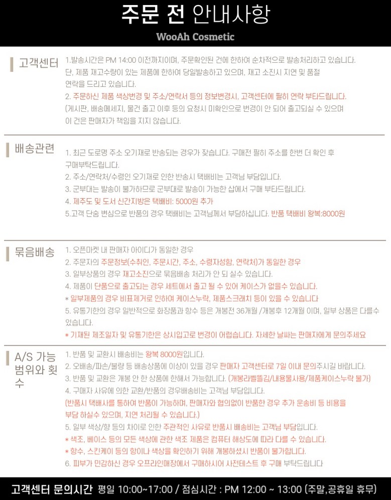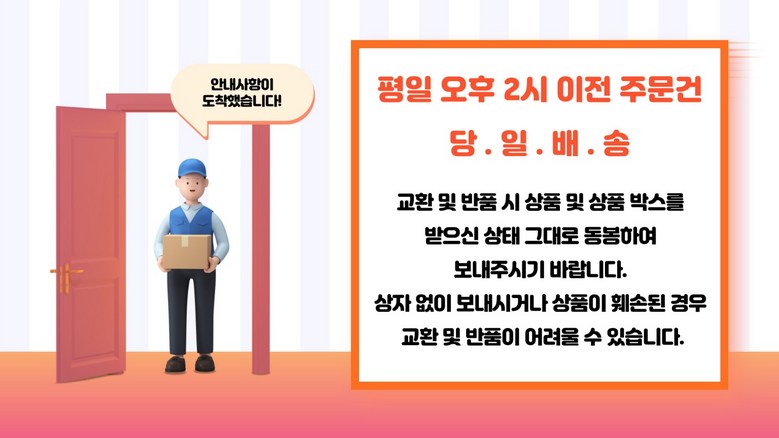 - ㆍ모니터 해상도의 차이로 인해 색상이나 이미지가 실제와 달라, 고객이 단순 변심으로 교환/반품을 무료로 요청하는 경우